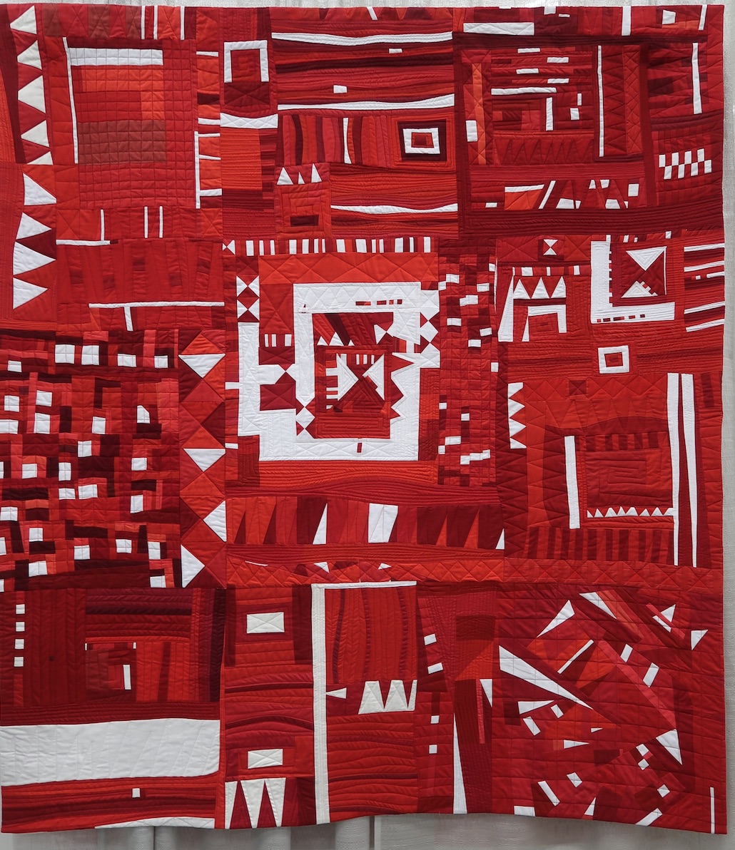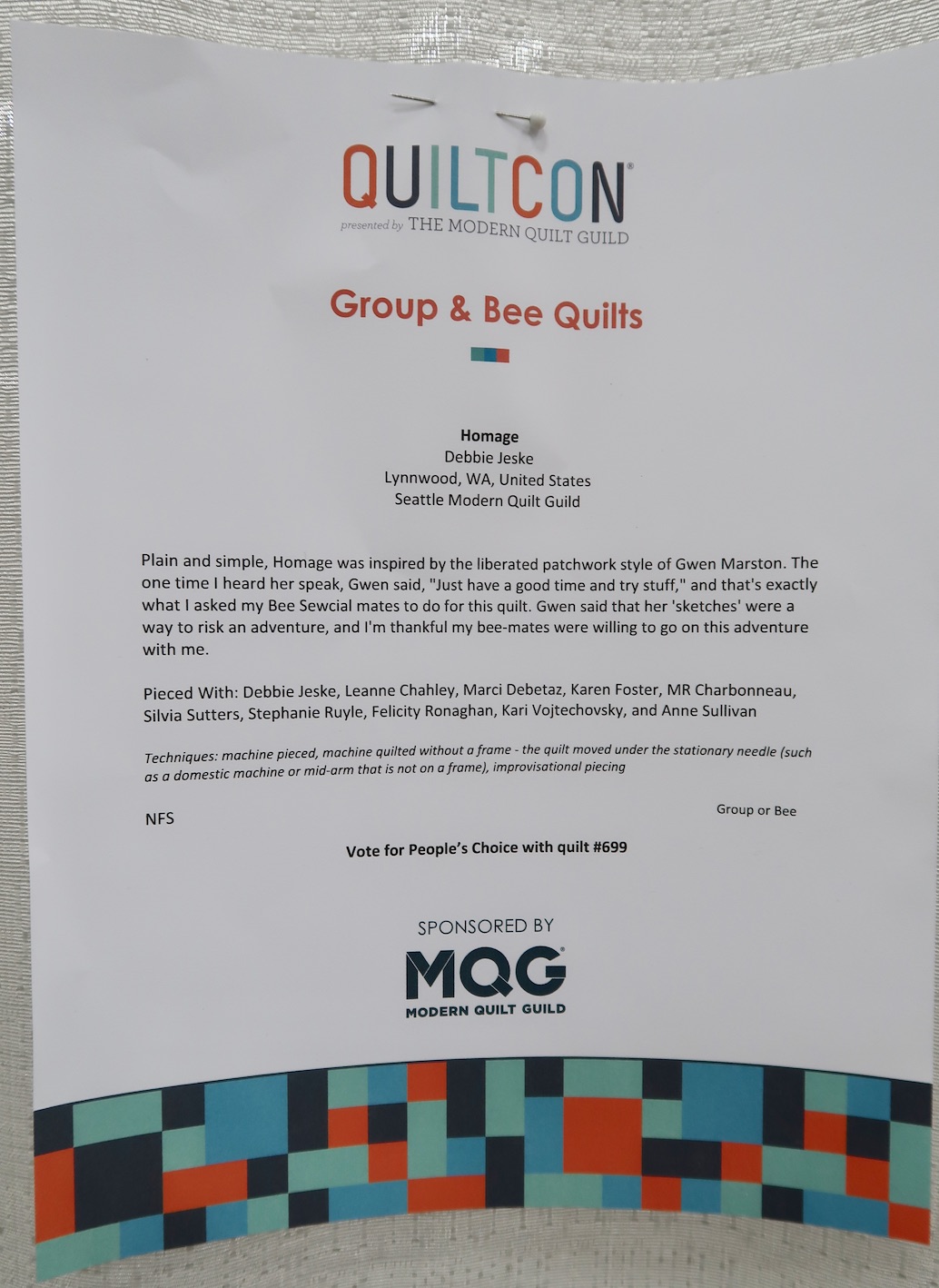 Homage by Debbie Jeske and others (see sign below), of the Seattle Modern Quilt Guild, was featured in the Group & Bee Quilts category at QuiltCon 2020.
