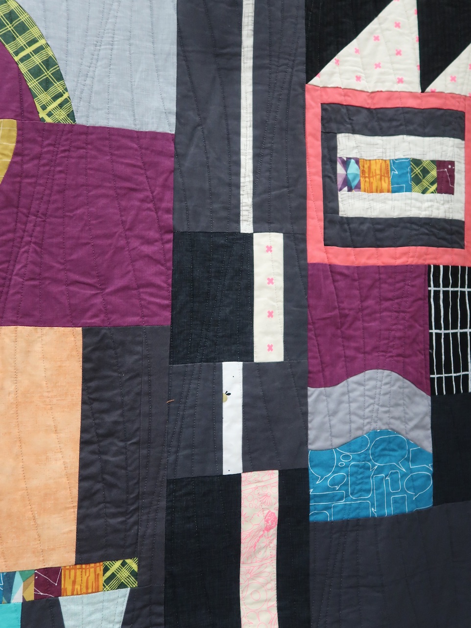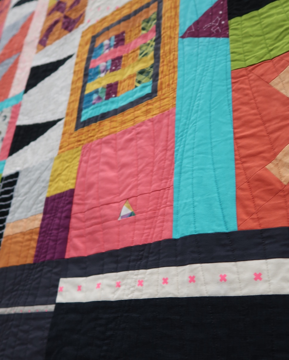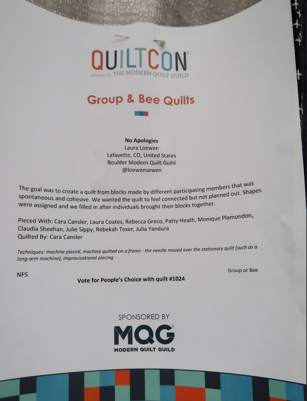 No Apologies by Laura Loewen and others (see names on sign below), of the Boulder Modern Quilt Guild, was featured in the Group & Bee Quilts category at QuiltCon 2020. Their goal was to create a spontaneous and cohesive quilt that was not "planned out." We think they did a great job.