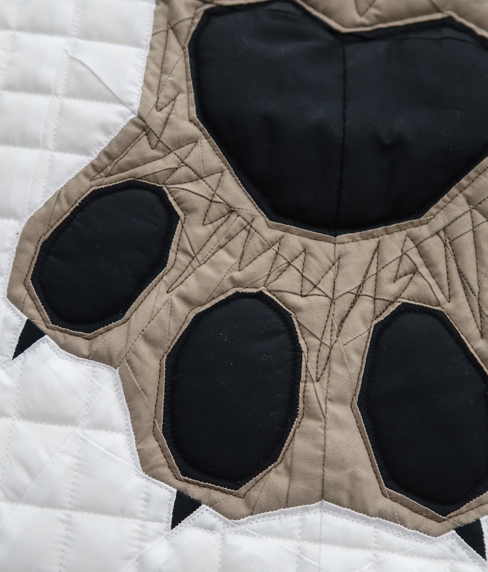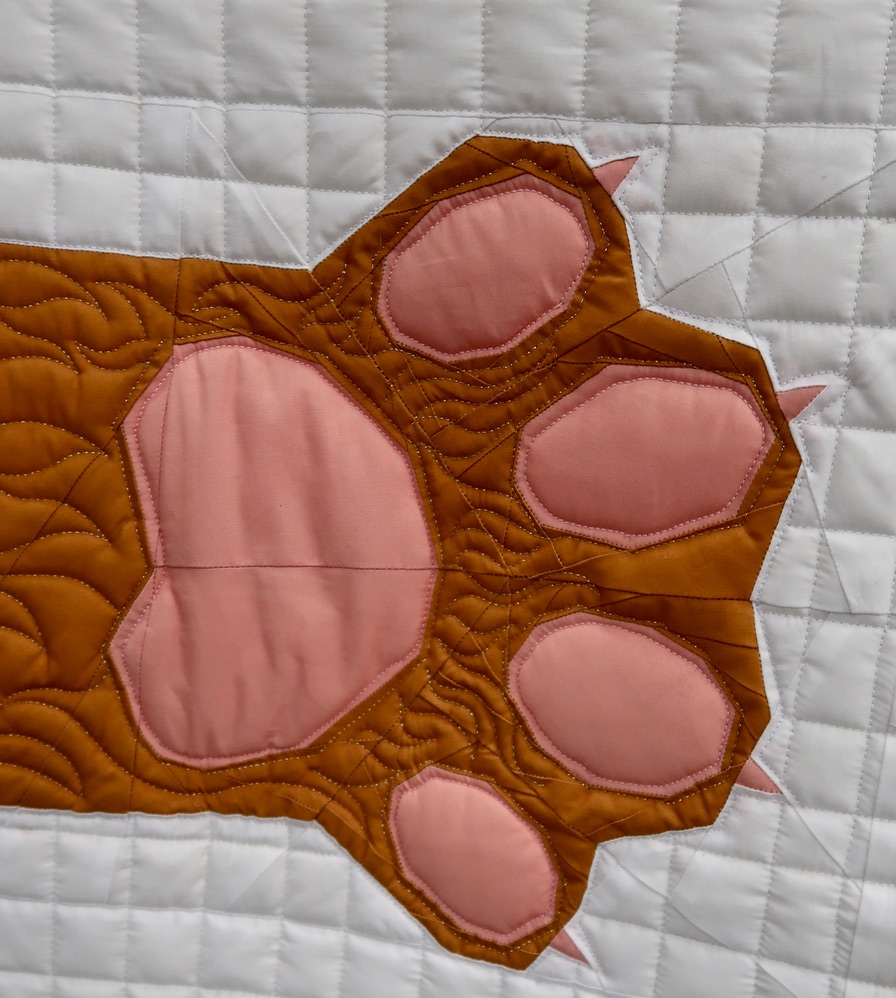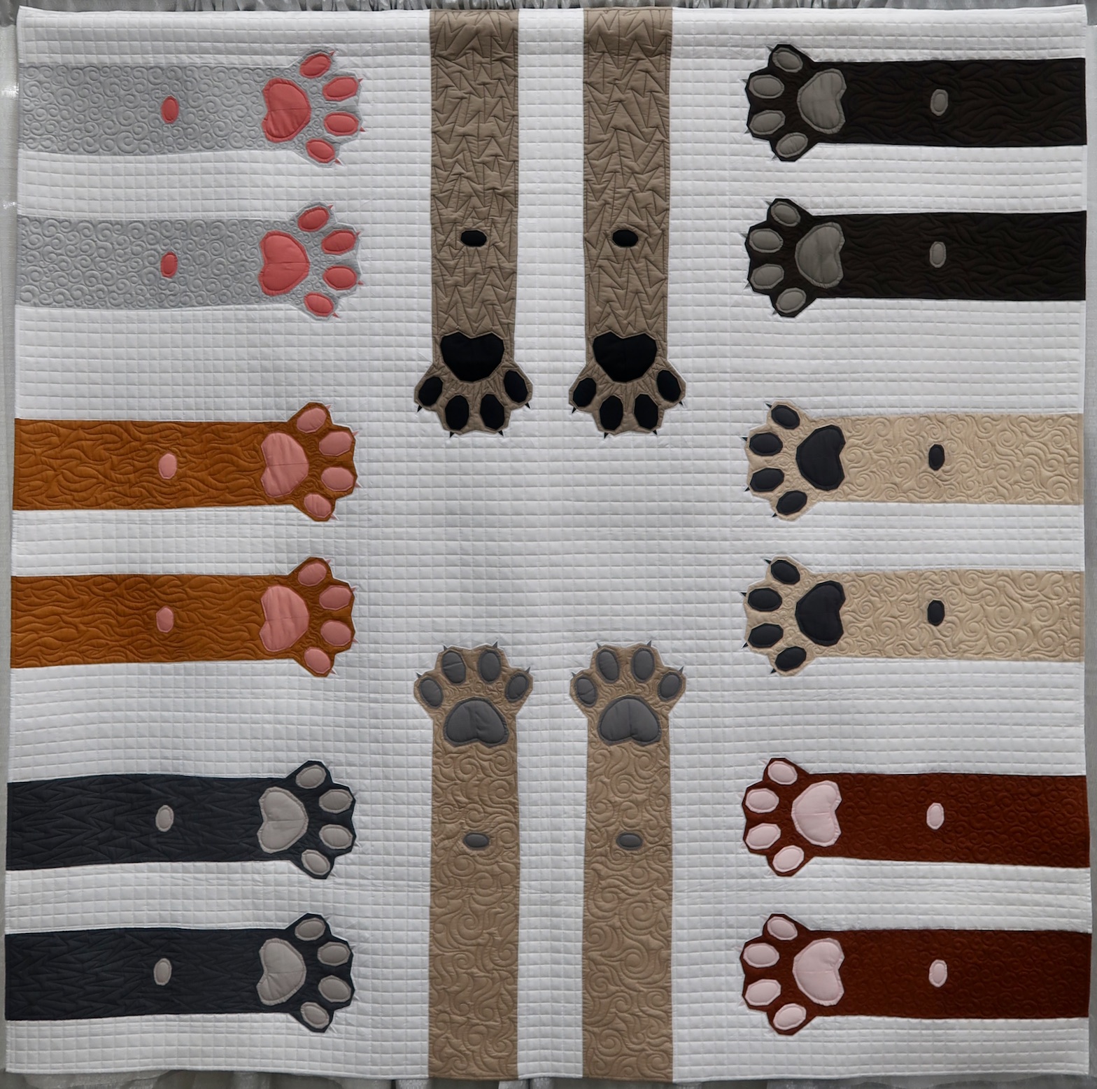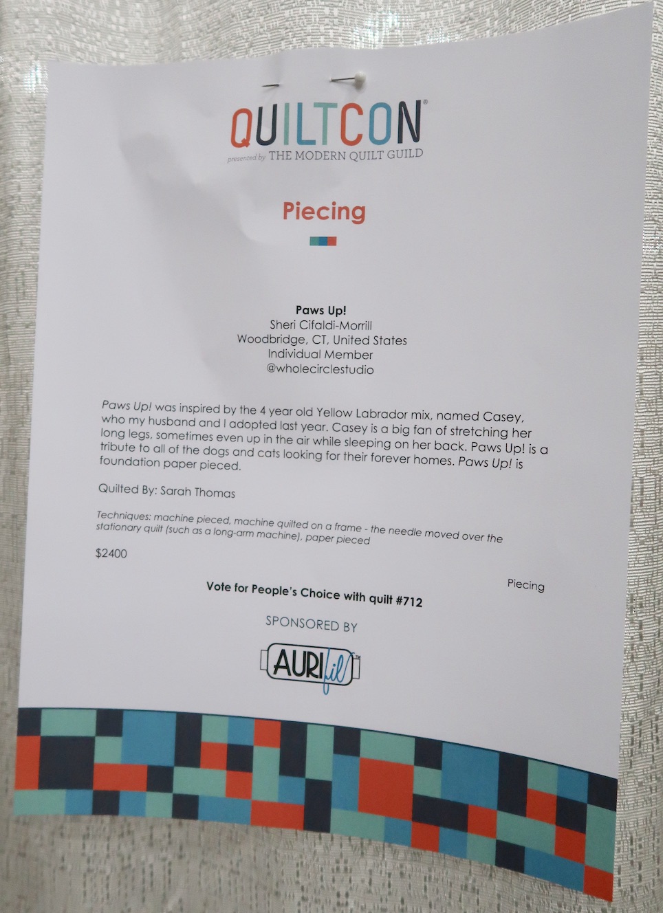 Paws Up! by Sheri Cifaldi-Morrill, of Woodbridge, CT, was featured in the Piecing category at QuiltCon 2020. It is a tribute to dogs and cats looking for forever homes and was inspired by her 4-year old Labrador mix, Casey, whom they adopted.