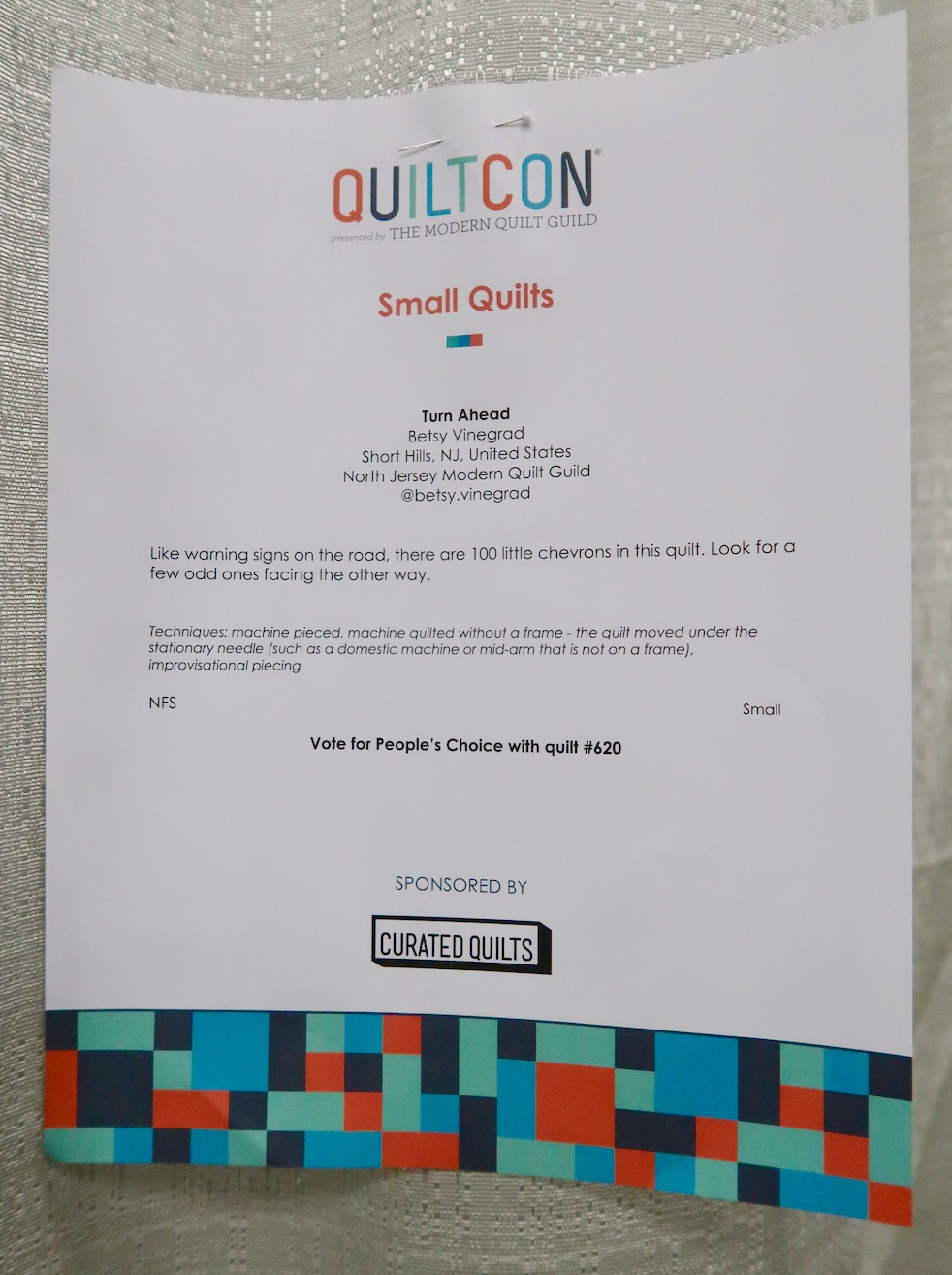 Turn Ahead by Betsy Vinegrad, of Short Hills, NJ and the North Jersey Modern Quilt Guild, won Second Place, Small Quilts at QuiltCon 2020.
