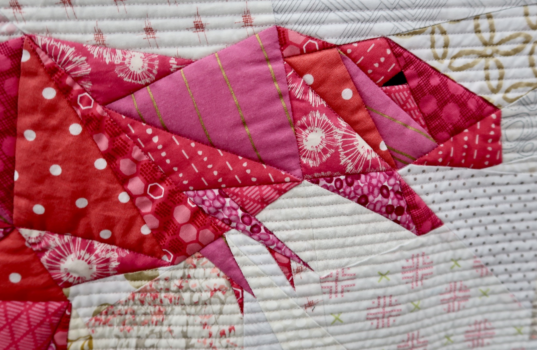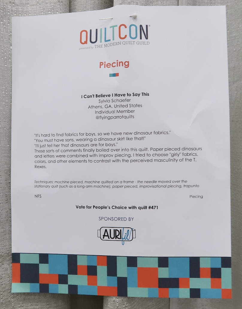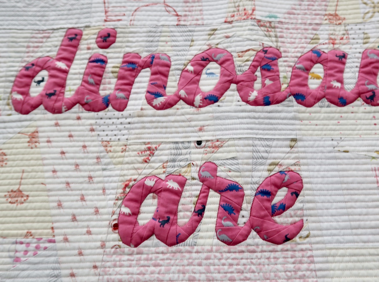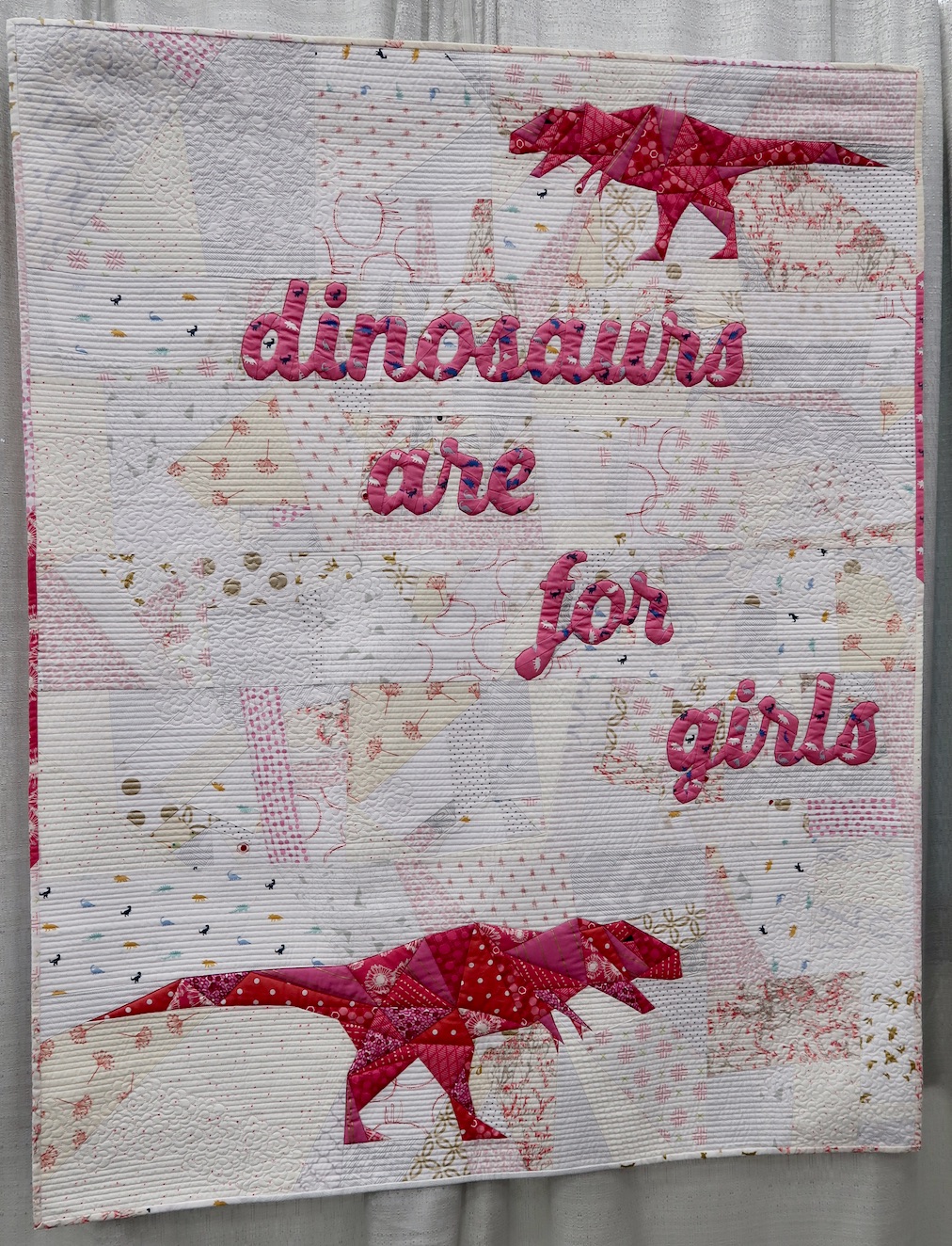 Sylvia Schaefer decided she'd had enough when everyone kept telling her dinosaurs were "just for boys". Take a look at this fabulous quilt she created with both improv and paper piecing. It brought a smile to our face and a lot of other little girls too at QuiltCon this year because "dinosaurs are for girls".