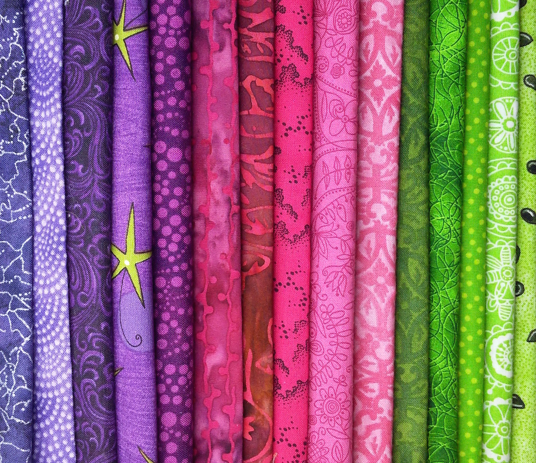 Example # 2 (below): This group of fabrics is a wider split-complementary plan using a 5-1 combination of Violet, Red-Violet, Purple, Fuchsia, Magenta, with Yellow-Green. If you are not sure about whether a fabric fits in your selected analogous color run, use the Ultimate 3-in-1 Color Tool to help solve the mystery. Each of the twenty-four pages illustrates the pure color, tints, shades and tones of a family, allowing you the opportunity to select from a wide array of fabrics to make a quilt more interesting.