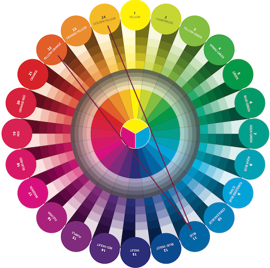The split-complementary plan takes one color, "the lead," a "supporting actor" color, and a "cast member" or two on either side of the lead's complement. For example, on our Essential Color Wheel, Blue is our lead color. Directly opposite of blue is orange-yellow. Our split-complementary will now be made up of blue, golden-yellow and yellow-orange (supporting actors and cast member). This combination allows for contrast without the harshness or vibrations of the complementary plan.