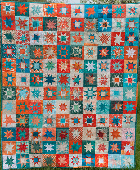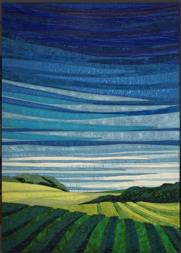 But like any plan, there are a few rules that need to be followed to achieve harmony with all the cast members. It is best to use an uneven number of 3, 5, or 7 colors in your analagous color selection [review Analagous (Lesson15)]. Definitely include the direct complement of blue (orange-yellow) when selecting fabrics as it makes for a softer and more subtle color shift (from Blue to Magenta) as in the example below by Hilde Morin in her quilt Afternoon Glow.