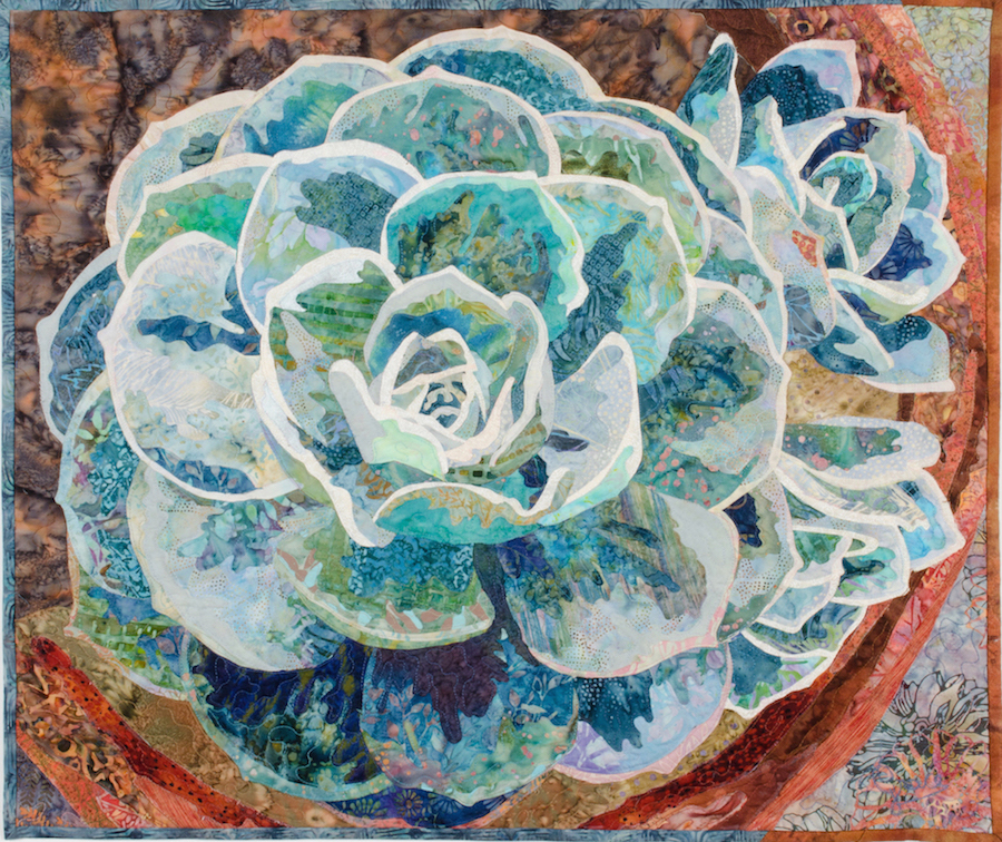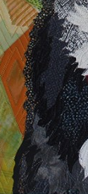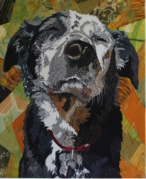 There are times when your desired effect is to have a less defined and 'blendy' result, as in the case of the fur of the dog in Sun Worship by Barbara Yates Beasley. Other subjects where a more 'blendy' effect could be used are landscapes, sunrises/sunsets, trees with many leaves, etc. The key to achieving success is to remember that when selecting fabric, try to incorporate a very wide range of tints, tones, shades and pure color. That way your design will have contrast, depth, and volume.