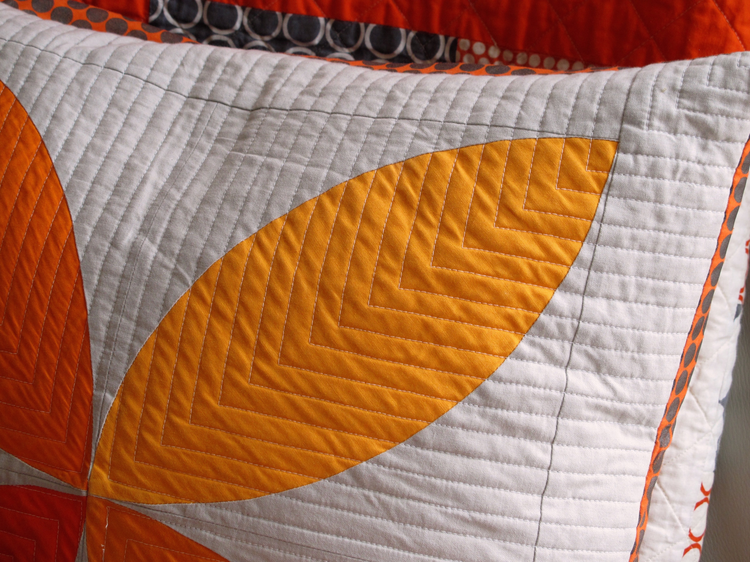 The trick to keeping a quilt from becoming visually flat is to use as WIDE a range of Tints, Tones, Shades and pure Orange as possible. Hand-dyed fabrics, with their subtle nuances, offer the quilter the widest range when it comes to working in a monochromatic plan. The old addage, "If five fabrics are good, then ten are even better," is a good thing to remember when building a fabric grouping. Learn more about Monochromatic color here.