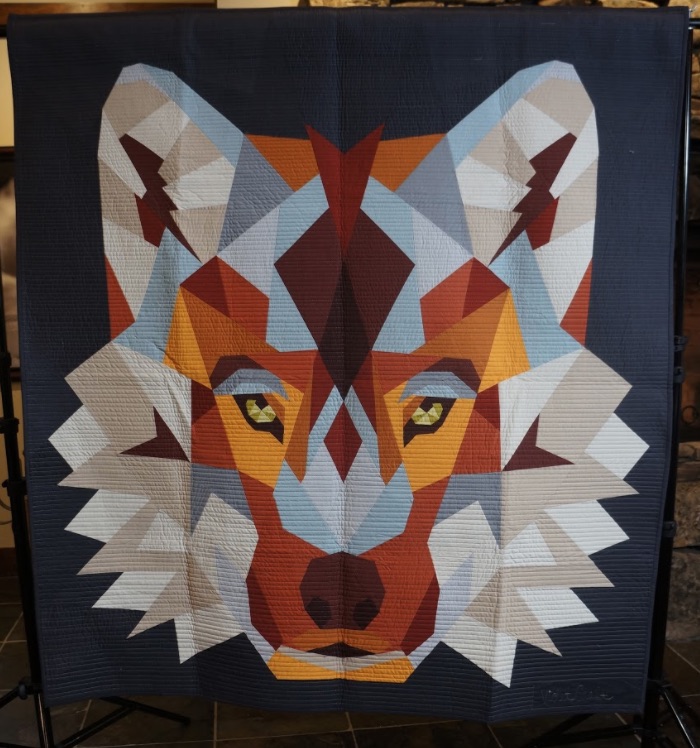 Violet writes of this quilt, "The Wolf is a fiercely loyal and territorial animal. Wolves make strong emotional attachments, but must rely on their own individual instincts to survive. Wolf Abstractions was created in my signature Abstractions style, hand drafted over my own original photography and patterned by me. After drafting the illustration I sewed, quilted and bound this quilt in 3 days with the constant encouragement and support of my pack."