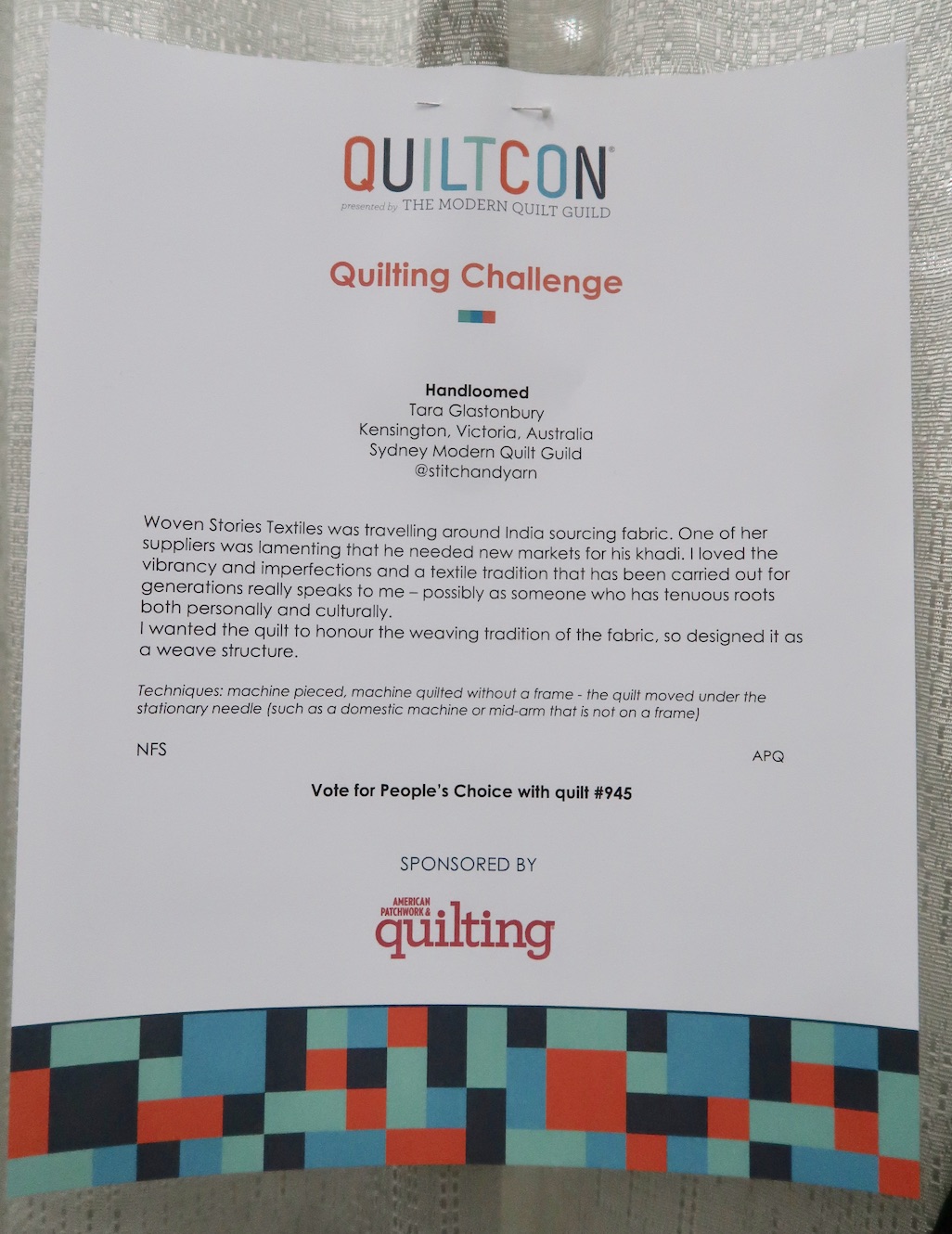 Handloomed won First Place, Quilting Challenge, sponsored by American Patchwork & Quilting, at QuiltCon 2020.