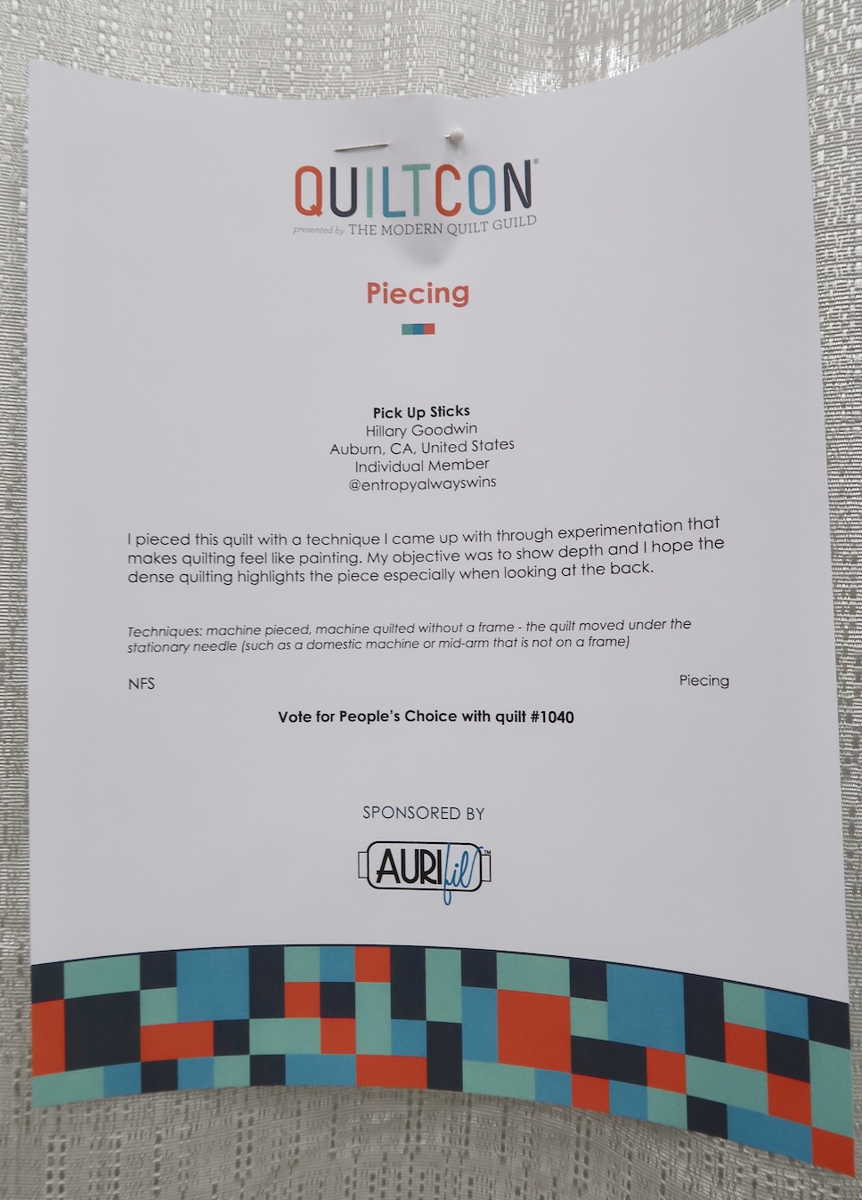 Pick Up Sticks by Hillary Goodwin won First Place, Piecing, sponsored by Aurifil, at QuiltCon 2020.