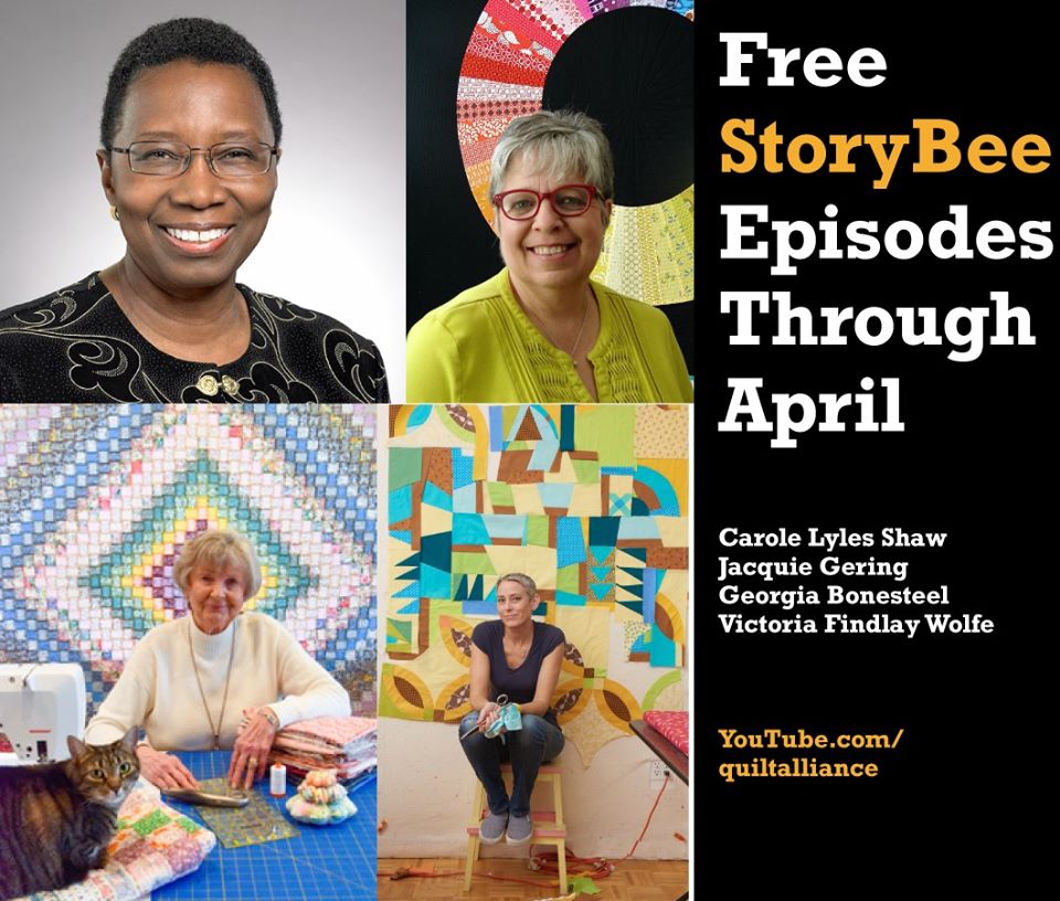 The Quilt Alliance is giving you access to FREE Story Bee Episodes through the month of April. StoryBee is a web-based interview show that records conversations with people from all corners of the quilt world, touring their workspace and finding out what’s on their minds.