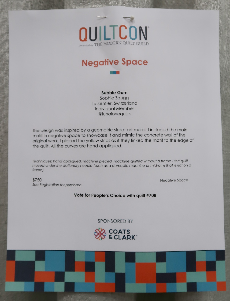 Bubble Gum by Sophie Zaugg won Second Place, Negative Space, sponsored by Coats & Clark, at QuiltCon 2020.