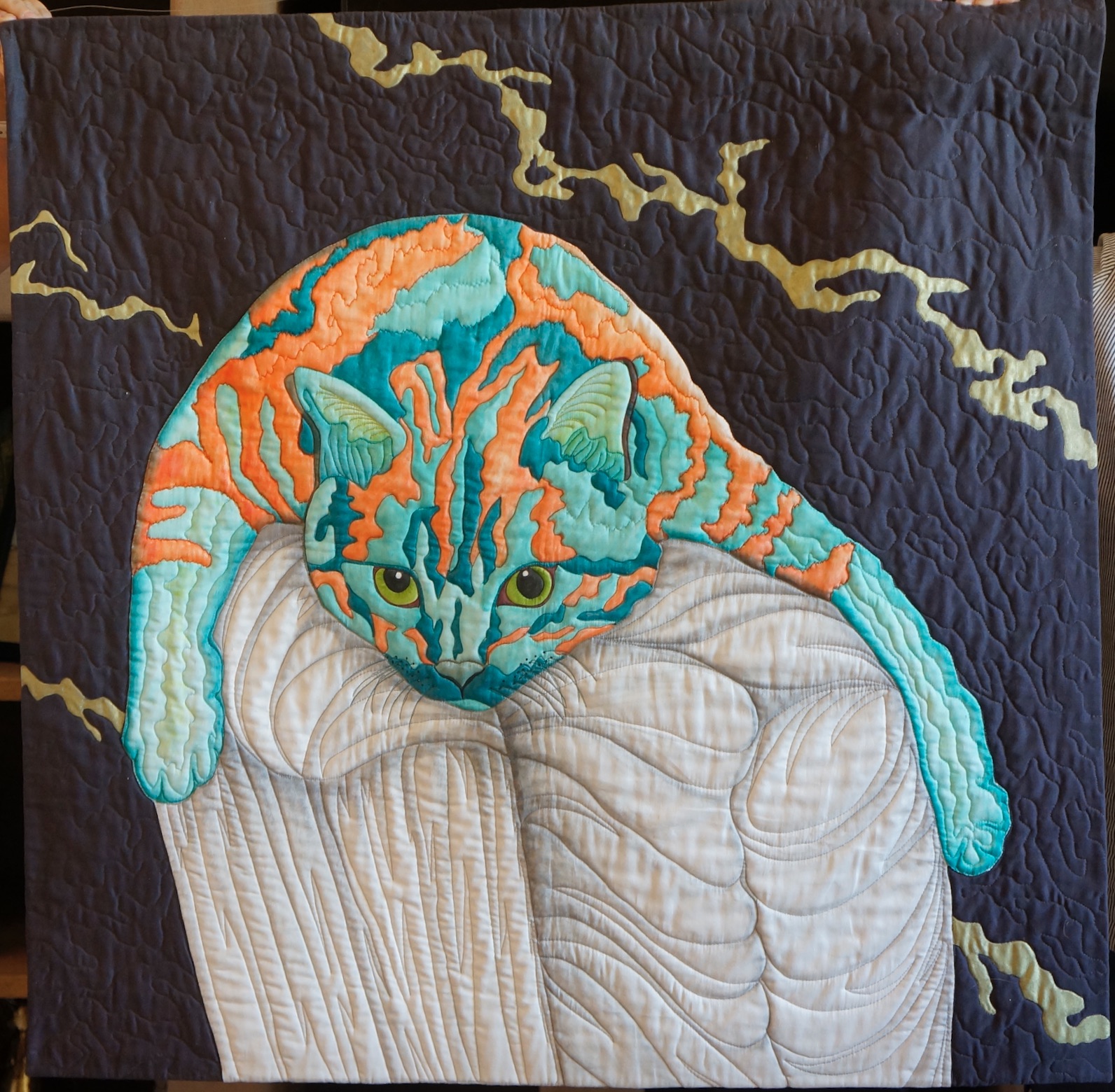 This amazing cat portrait quilt by June Jaeger, Rudy... Hard Day at the Office, uses quite unusual colors, yet still looks amazingly natural. How does June make these creations? Find out in Show 2610.