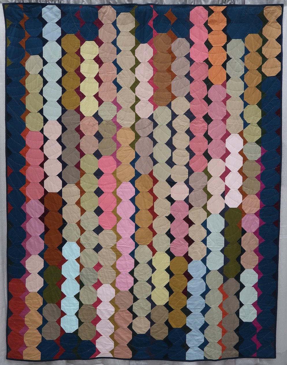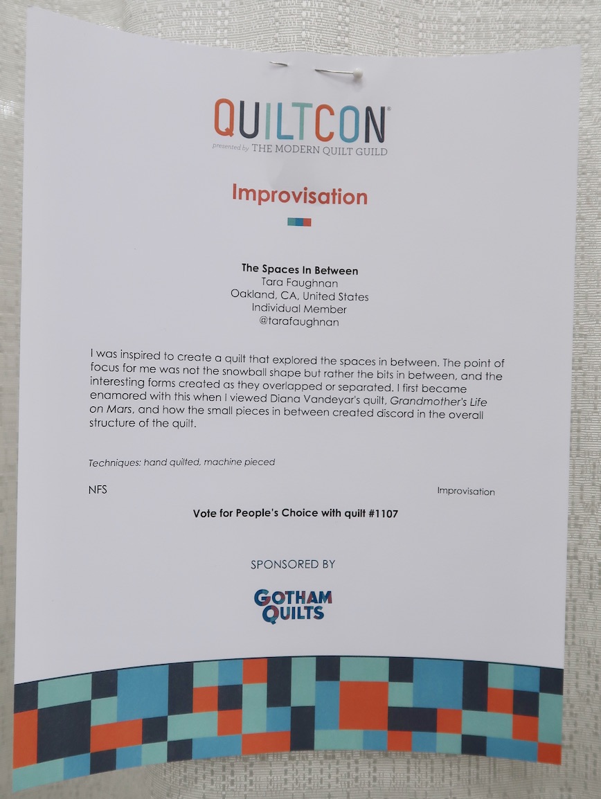 The Spaces in Between by Tara Faughnan of Oakland, CA was featured in the Improvisation category, sponsored by Gotham Quilts, at QuiltCon 2020.