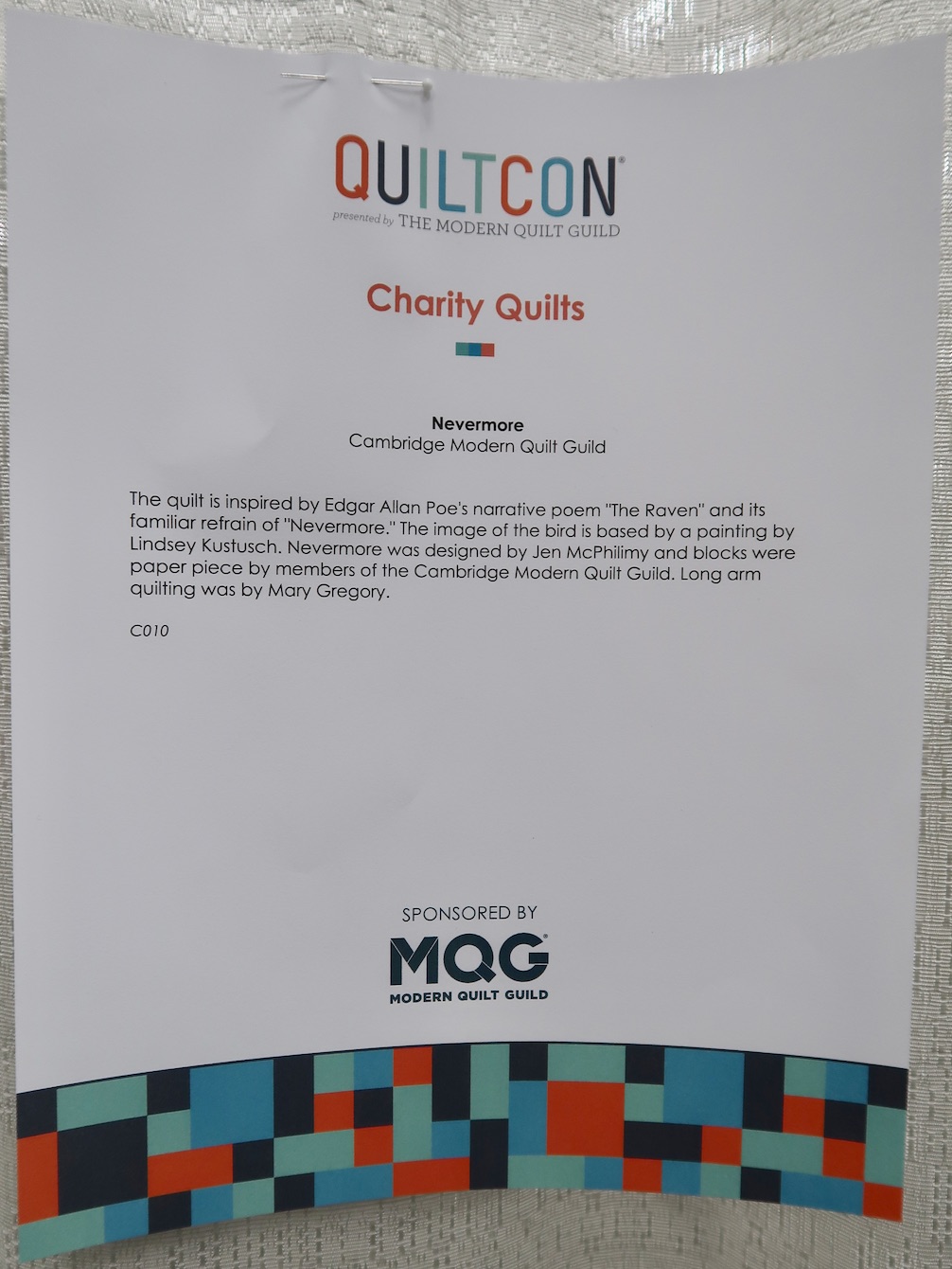 Nevermore by the Cambridge Modern Quilt Guild was featured in the Charity Quilts category, sponsored by the Modern Quilt Guild, at QuiltCon 2020.