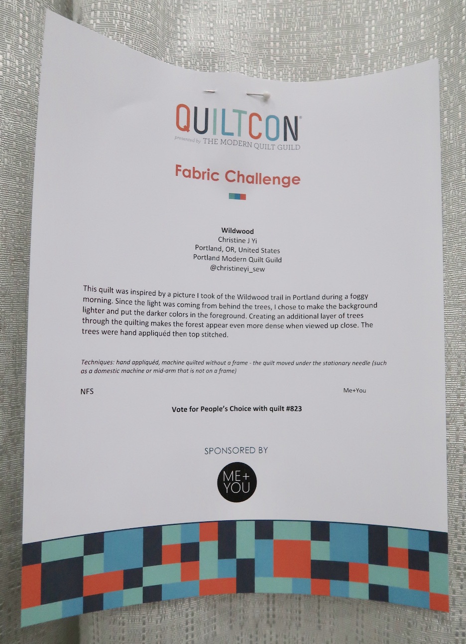 Wildwood by Christine J. Yi of the Portland Modern Quilt Guild won Second Place, Fabric Challenge, sponsored by ME + YOU, at QuiltCon 2020.
