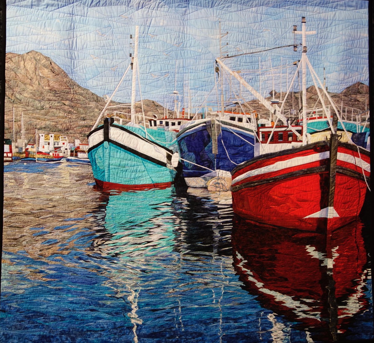 “I was fortunate to teach quilting in South Africa. While there, we took a side to and visited Cape Town. This picture was taken in a fishing village there. I loved the bright colors and the reflections were something I wanted to try to recreate in fabric. I am constantly amazed at the beautiful places where quilting takes me. This quilt took about a year to make and has approximately 8400 individual pattern pieces in it.”