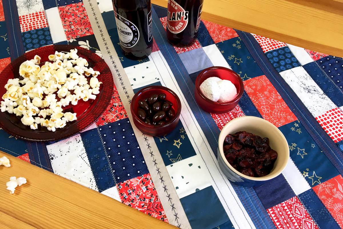 Here's a great project from Art Galley Fabrics and WeAllSew. All you need are scraps of rectangles, squares, and strips to put this table runner together. Decorative stitches and a new finishing technique finish up the design.