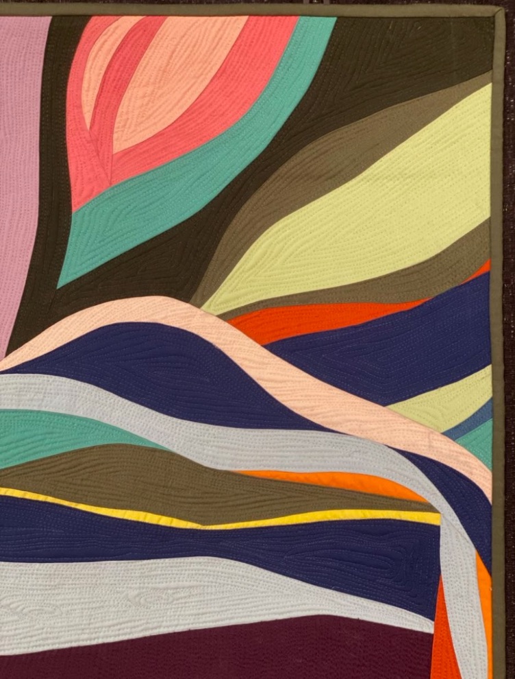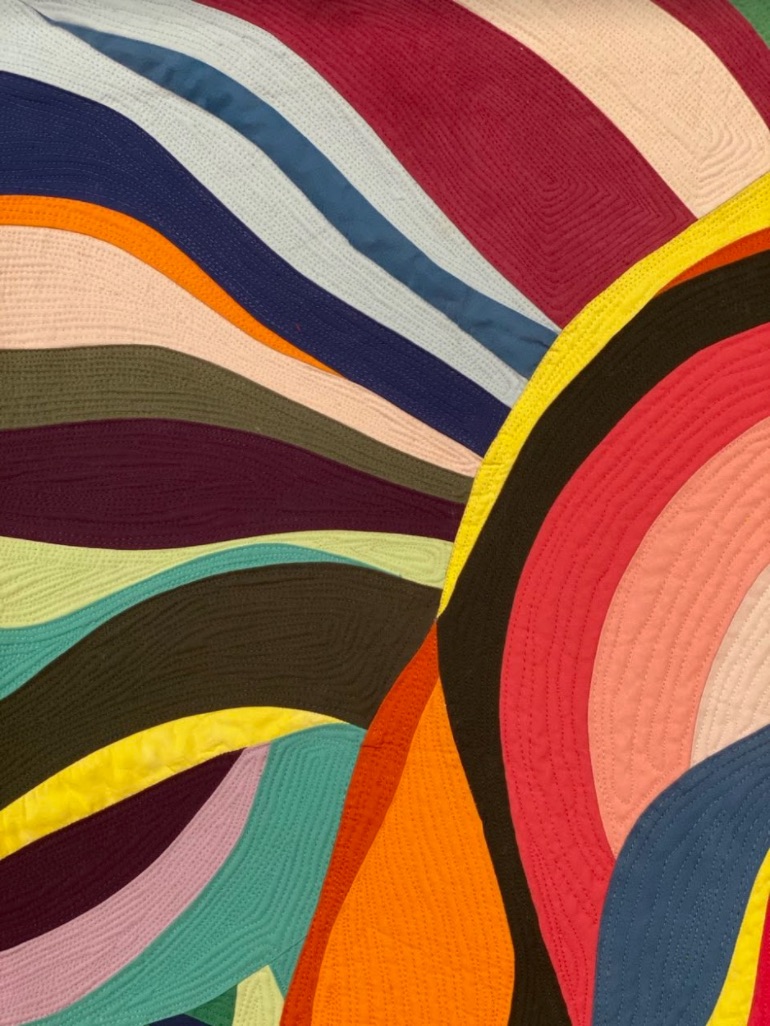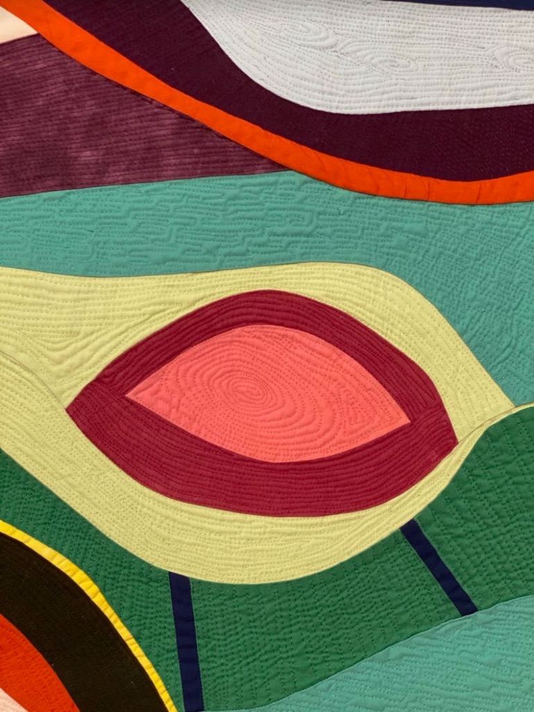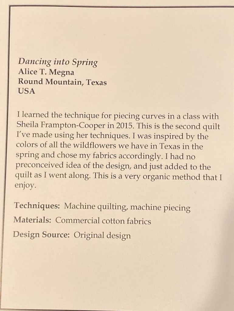 Alice T. Megna made her quilt, Dancing into Spring, using a technique she learned for piecing curves from Sheila Frampton Cooper. She was inspired by the wildflowers growing in Texas during spring, and just like nature itself, she let design come organically to her rather than planning it out ahead of time.