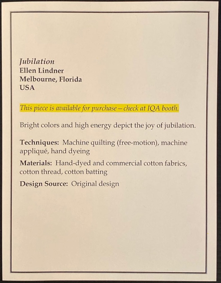 Ellen Lindner felt her quilt, Jubilation, should represent the bright colors and high energy of the joy that comes with any jubilation. We think she did a great job getting the feeling across.