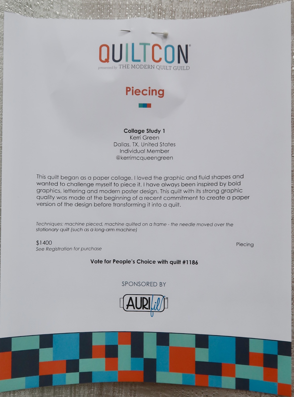 Kerri Green wanted to create a quilt which she first designed as a paper collage. Once put to paper, transferring the design to fabric made for challenging piecing. And if you've been following along with Alex's demonstrations of straight line quilting, wait until you see the detail in Collage Study 1, exhibited at QuiltCon 2020.