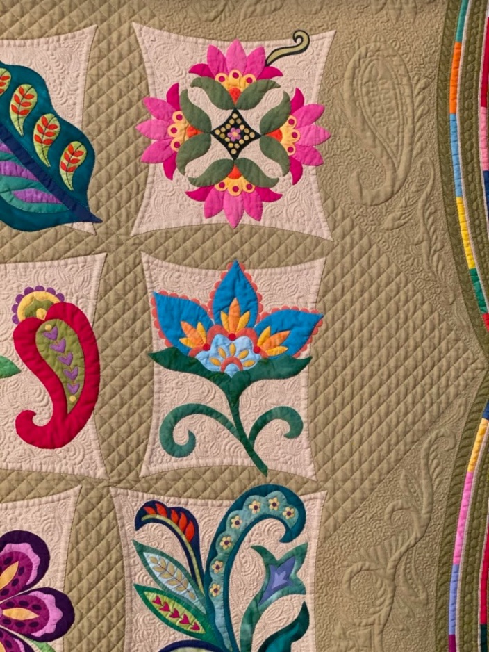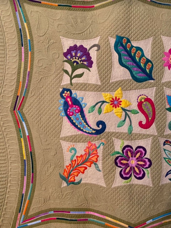 Laura Welkin takes making a 9 patch quilt to another level with her Nearly a 9 Patch quilt (which really sort of has 8 patches of amazing appliqué). Outside of the appliqué is some stunning quilting and a very unusual pieced inner border.