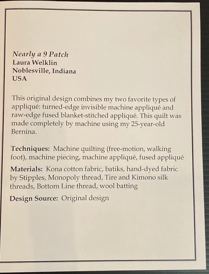 Nearly a 9 Patch by Laura Welkin of Noblesville, Indiana was featured in the Appliqué, Small category at Houston 2019.