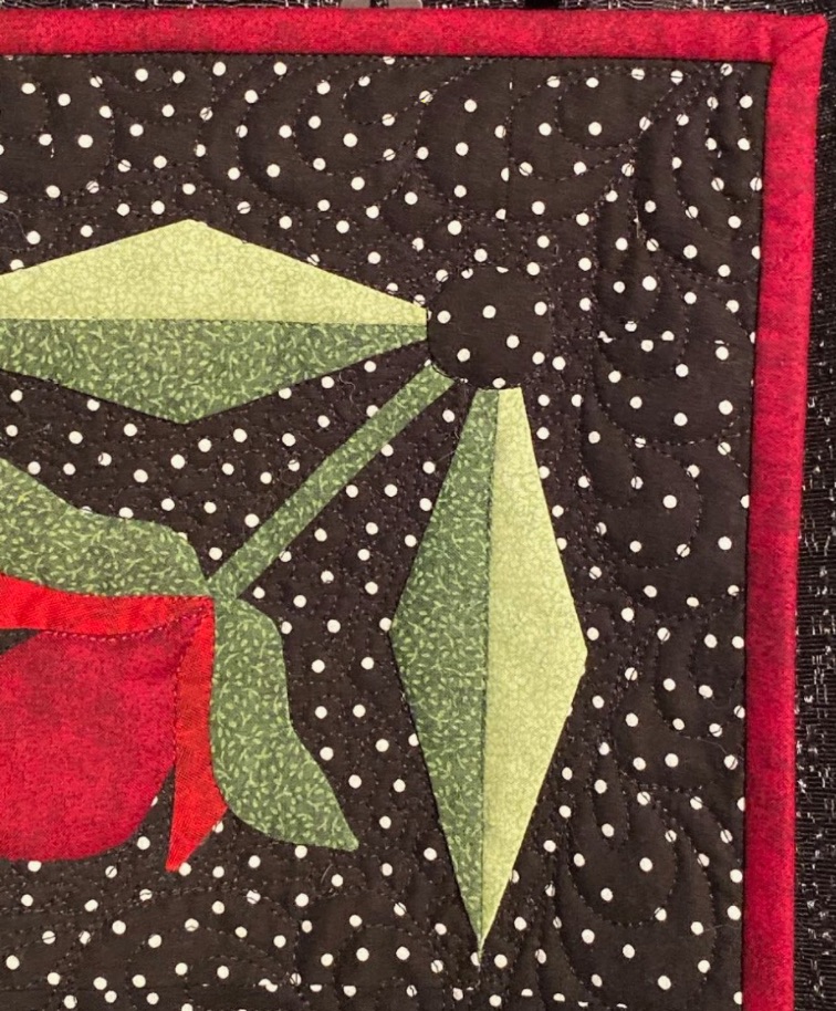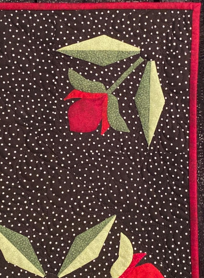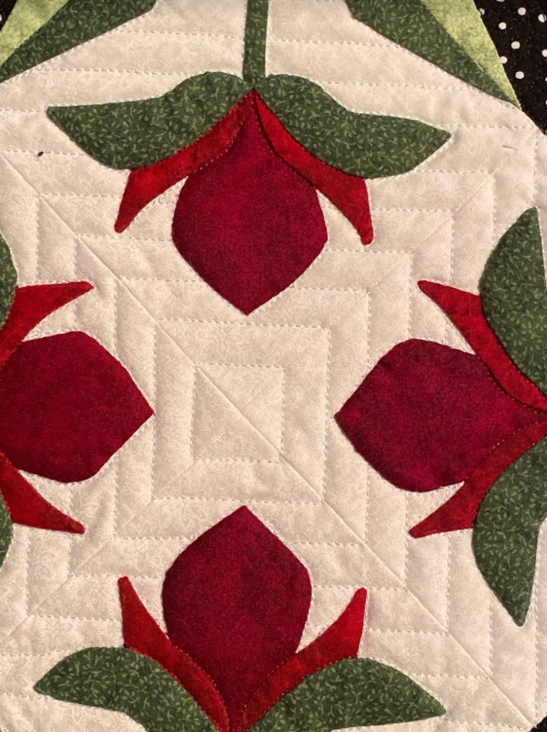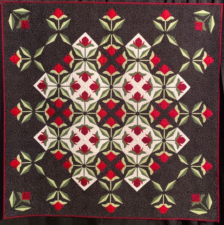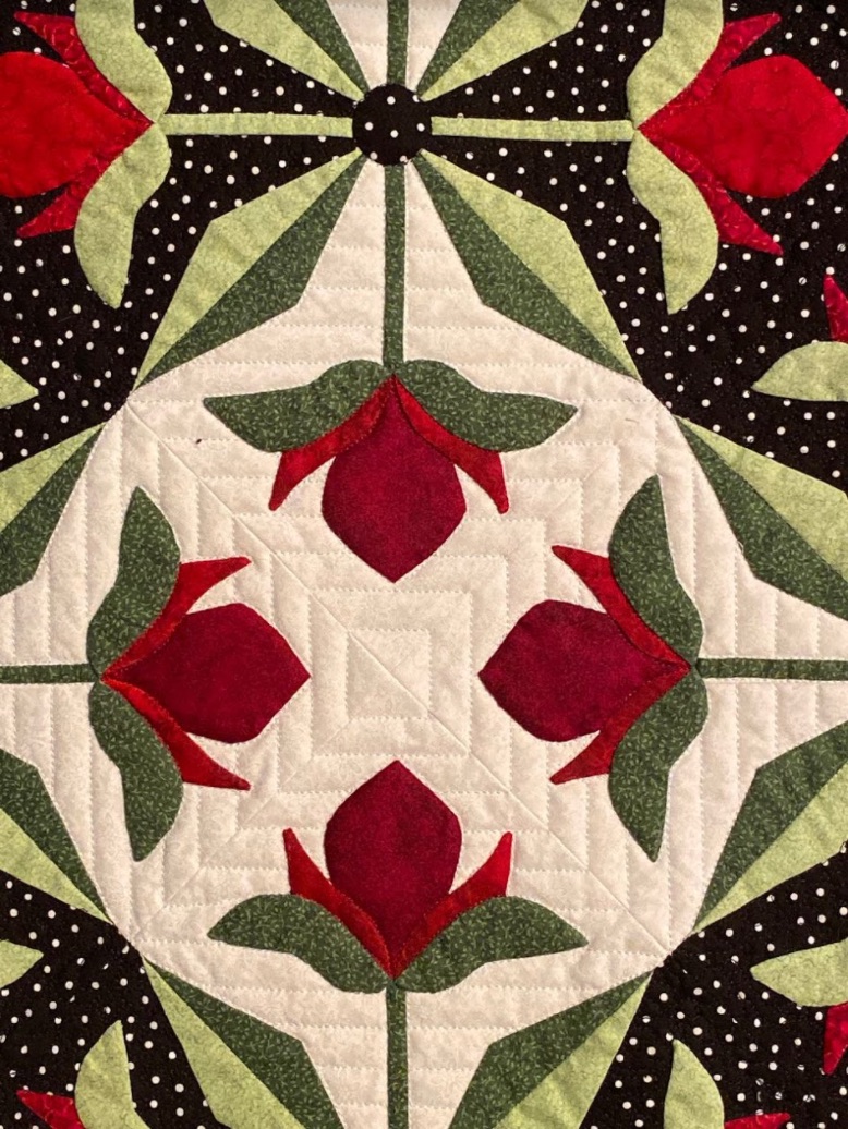 Susan M. Arnold completed this hand appliquéd beauty, Mediterranean Rose, on a cruise in the Mediterranean. While traditional in design, the color palette of red, green, and white on a black polka dot background gives it a modern feel. Hand appliqué, what a great way to relax while cruising.