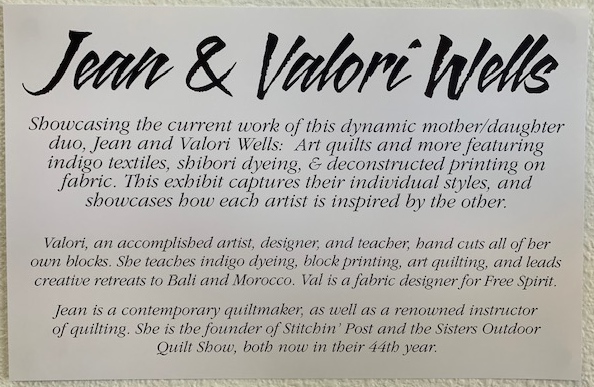 I had to stop by the Stitchin' Post because there is a wonderful mother/daughter display, which if you are traveling through town you must stop and see. Jean Wells Keenan started the quilt show 45 years ago with just a handful of quilts...now it has grown into a mega event and her daughter Valori Wells is at the helm of the Stitchin' Post ship. What better way to commemorate the history than by having a display in the Twigs Gallery by both these wonderful artists.