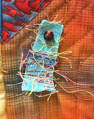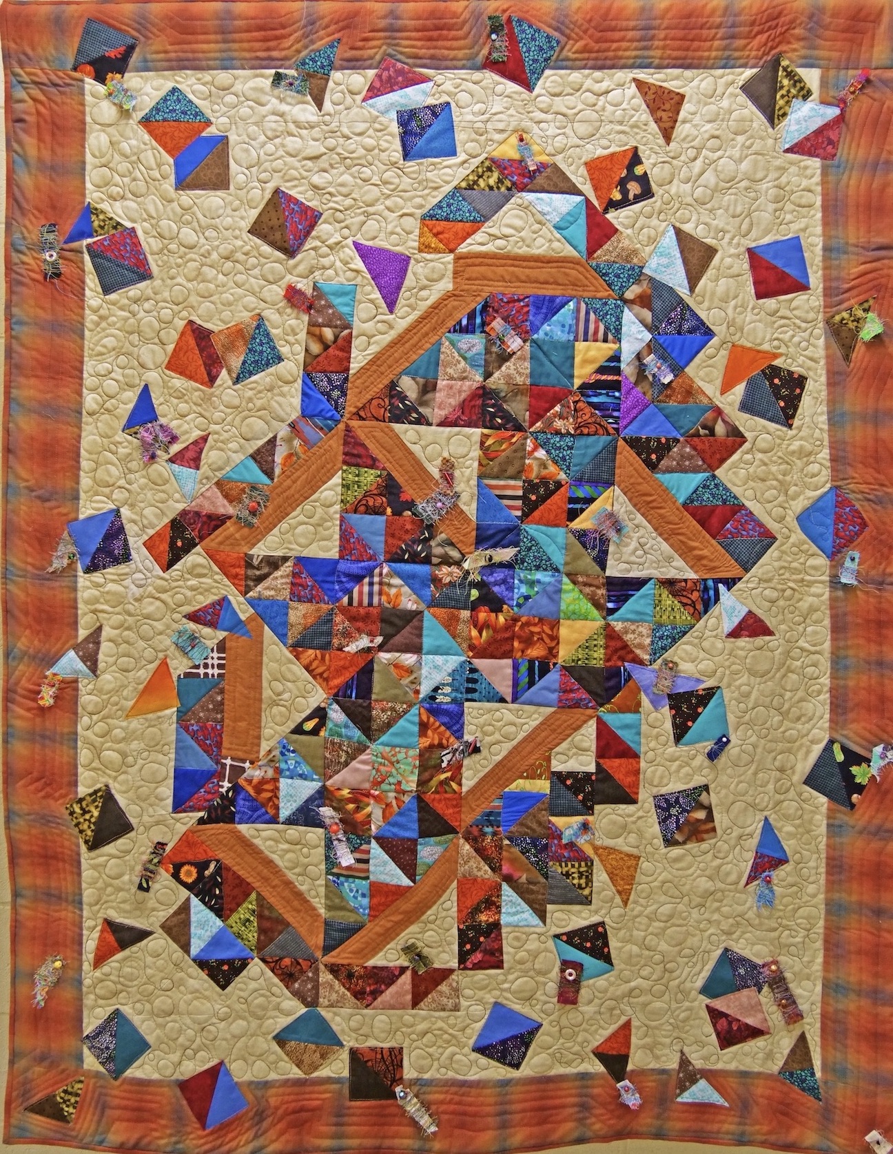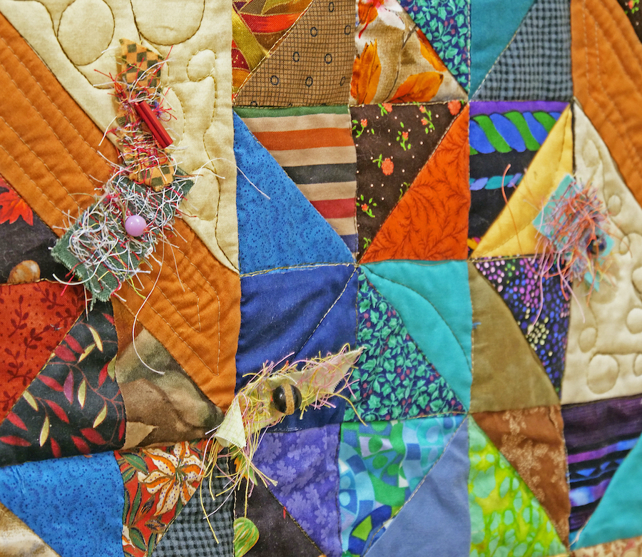 Fabric scraps from another project were pieced to form blocks that are scattered across the quilt top. Linda used small bits of fabric to represent the “virus” and as a place to start her machine piecing (no wonder everything lines up so well for her). The background is filled with hundreds of quilted circular, and almost invisible 'viruses" quilting design. Additional “Virus” bits are attached using a variety of embellishments including beads and metal rings.