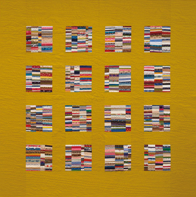 When I start a quilt I set up what I call design parameters. For Go With The Flow I first chose the technique (string piecing), layout (rectangles juxtaposed with squares) block colours (scrap and a specific palette), border colour (solid). I wanted the strong patterning of the 16 square blocks in a square layout, with sashing, to counter the “chaos” of the string piecing, scrap colours, and asymmetrical construction of the individual blocks. The regular patterning of the large blocks sends the first invitation for the viewer’s eyes to travel from block to block, seeking similarities.