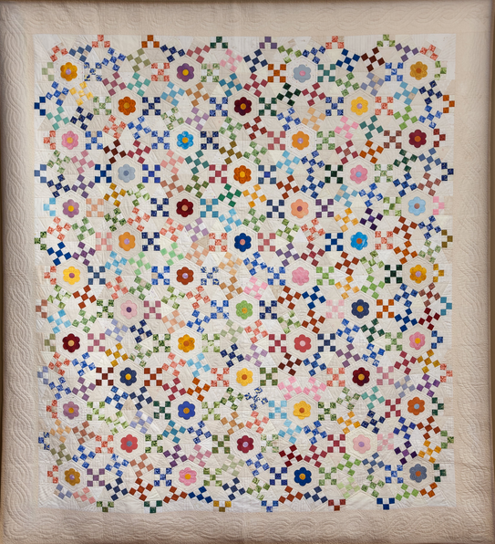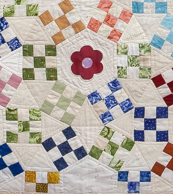 Lessa Siegele's (Show 1801) Ring Cycles is based on a Jack’s Chain block. The combination of nine-patch and equilateral triangles, along with unusual color placement, take the eye on a happy journey around the quilt. View the quilt in detail here.