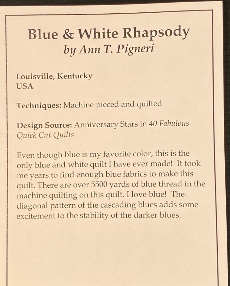 "Quilters have long used the color blue to symbolize trust, loyalty, wisdom, confidence, intelligence, faith, truth, and heaven. Sapphire is also the chosen gem to celebrate 45th anniversaries—which International Quilt Festival is doing this year (2019)! These new and antique blue and white quilts will be suspended from the ceiling in a spectacular and unforgettable display."