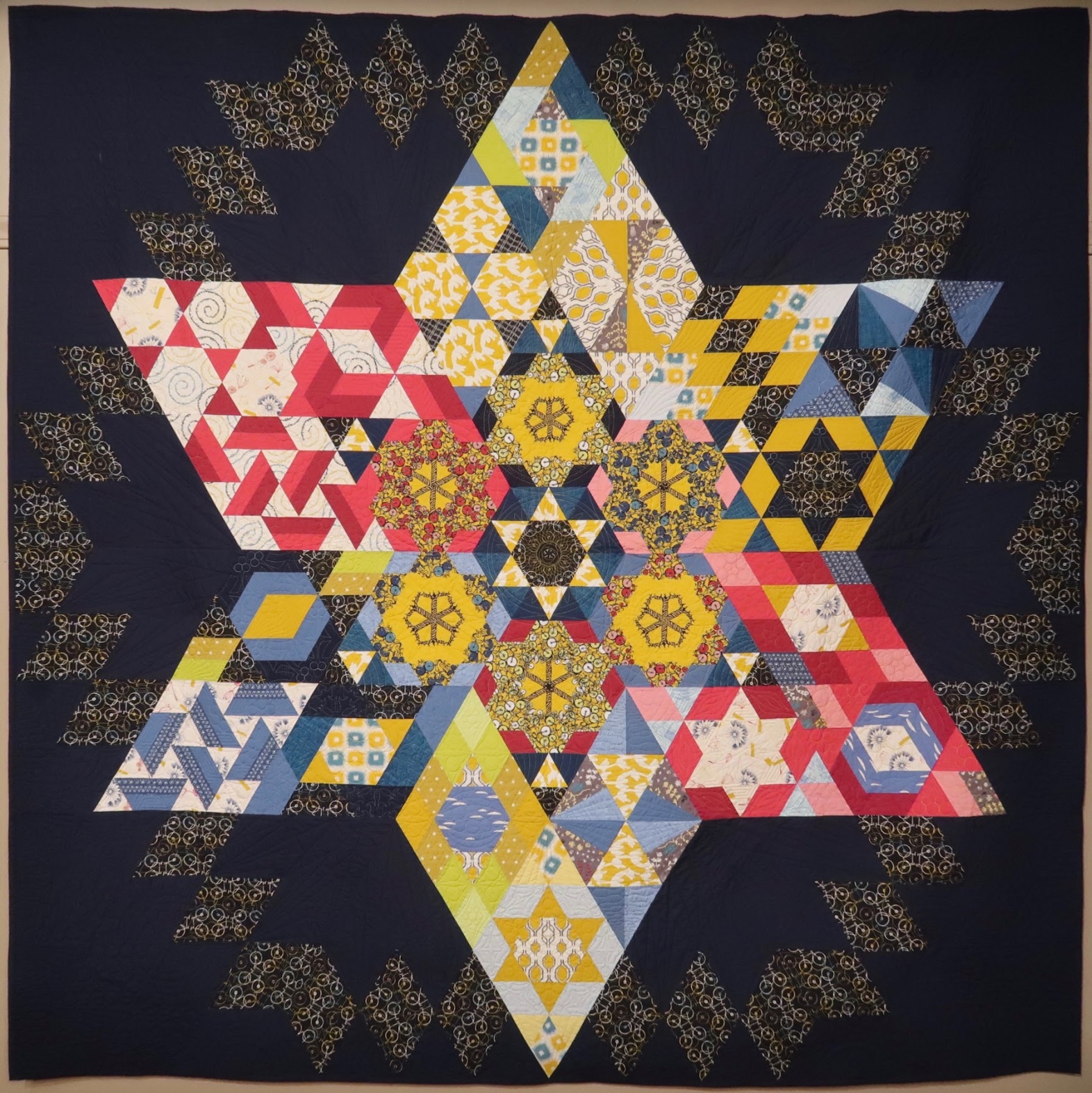 Along with her signature triangle block design, Pam Raby's Crank It Up quilt features a pattern throughout that resembles a bicycle wheel. This was done in tribute to her husband's love of bicycling.