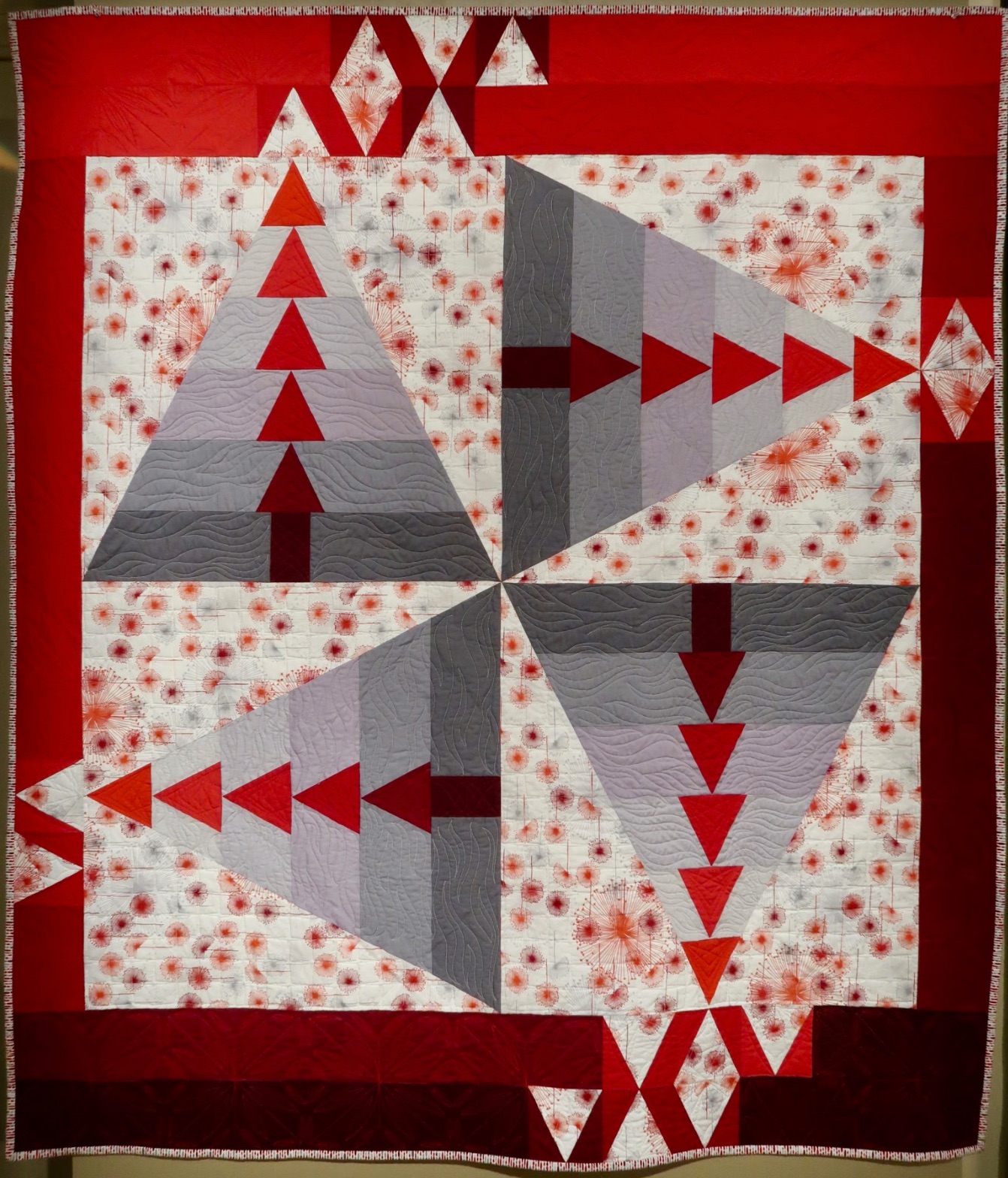 Using her Sequoia pattern, Pam Raby made a red version of her Sequoia quilt and used a print instead of a solid to see how different the same quilt can be using different fabrics. She also incorporated more of her triangle-in-a-square blocks to pump up the border.