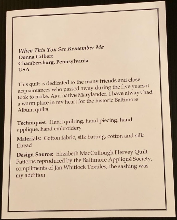 When This You See Remember Me by Donna Gilbert of Chambersburg, Pennsylvania was featured in the Appliqué, Large category at Houston 2019.