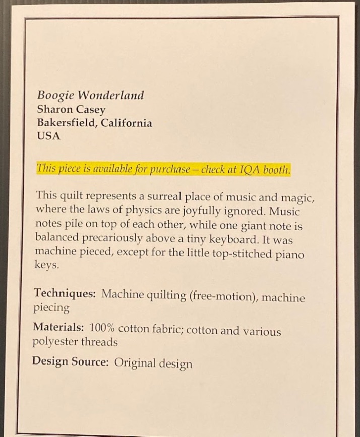 Sometimes in quilting you just need to let your ideas flow free. If you want your music notes to be three times the size, let them be. That's exactly what Sharon Casey did in her machine pieced quilt, Boogie Wonderland, "where the laws of physics are joyfully ignored."
