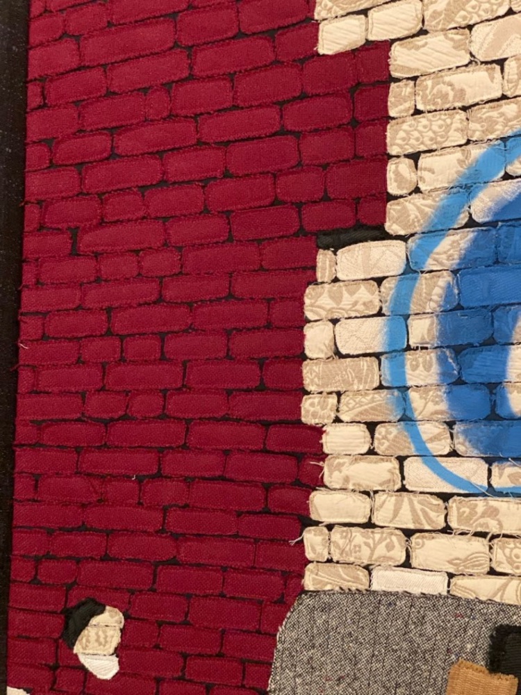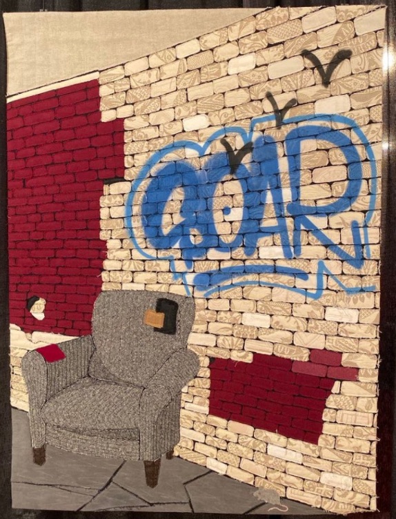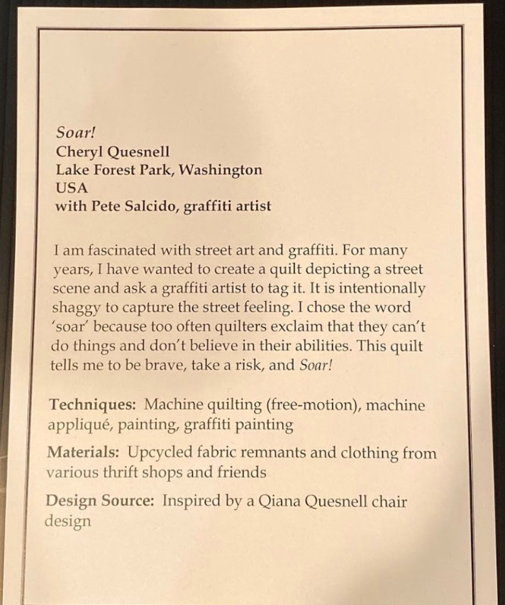 Cheryl Quesnell always wanted to depict a street scene in a quilt and have a graffiti artist tag it. She did just that with Soar! and had Pete Salcido tag with its title. To Cheryl, Soar means to take a risk and and be brave, which we think she did very well with this quilt.