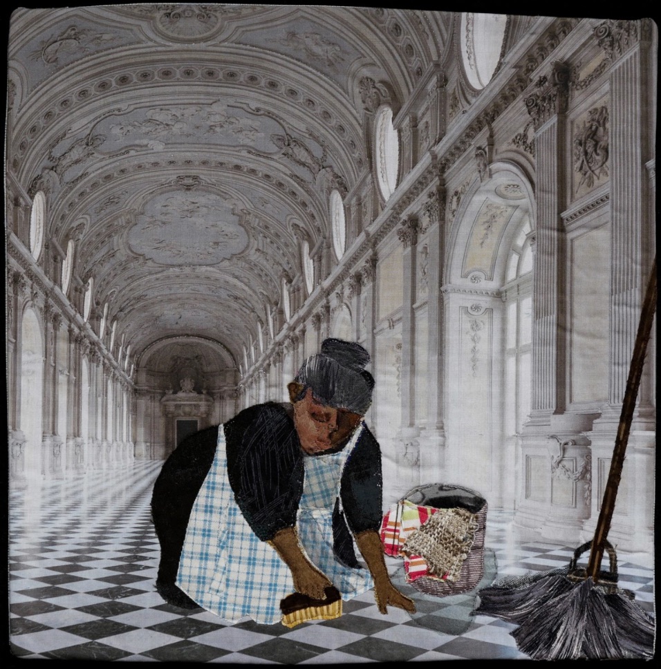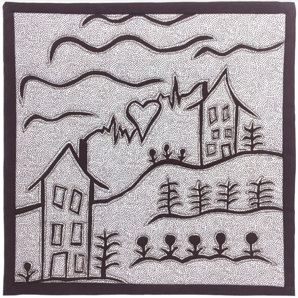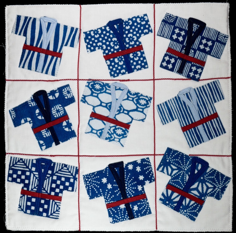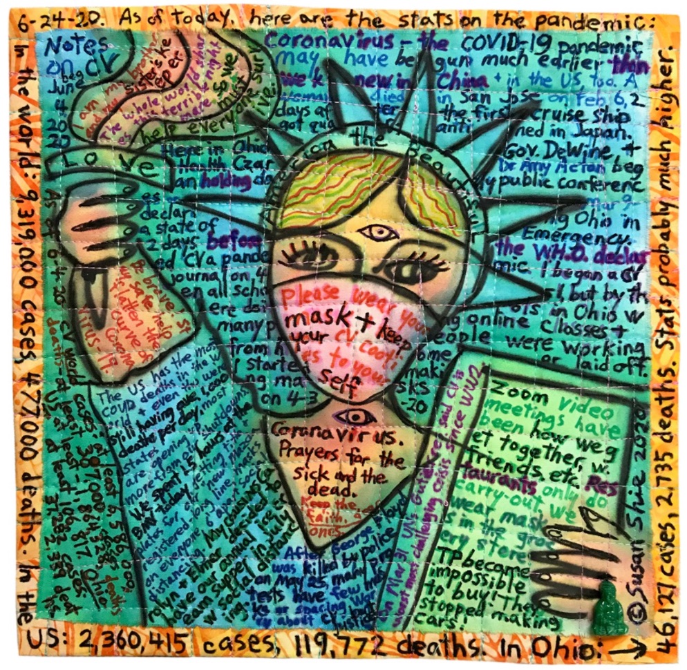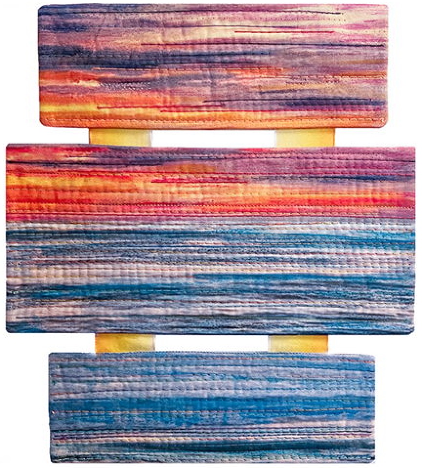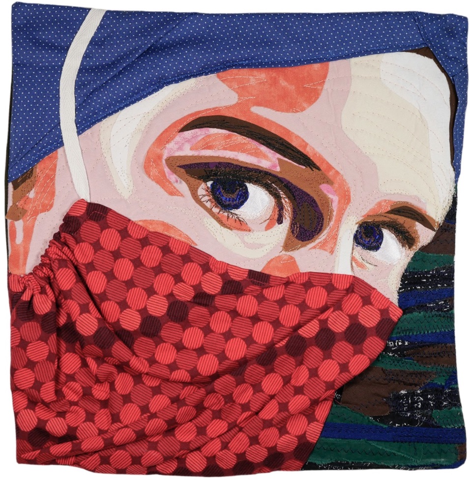 Several artists used the COVID-19 pandemic as their theme, including Jayne Bentley Gaskins, who donated Remnants of Care, and Susan Shie, who created Coronavirus Haiku. Other artists provided a reminder of the power of nature, including Elaine Quehl, who made Reflection, and Cat Larrea, who designed Through the Forest. Variety and creativity are also evident in pieces such as Alice Beasley’s In a Day’s Work, Candice Phelan’s Ocean Sunset 1, Jo Noble’s A Matter of Perception, and Ana Buzzalino’s Circles of Red. A playful yet thoughtful vibe is found in Bodil Gardner’s Woman Of The Year 2020, Karen Miller’s Yukata and Sandy Snowden’s Ramshackle: Distancing. A perceptive closeup is offered by Fuzzy Mall with Look Up (Self Portrait).