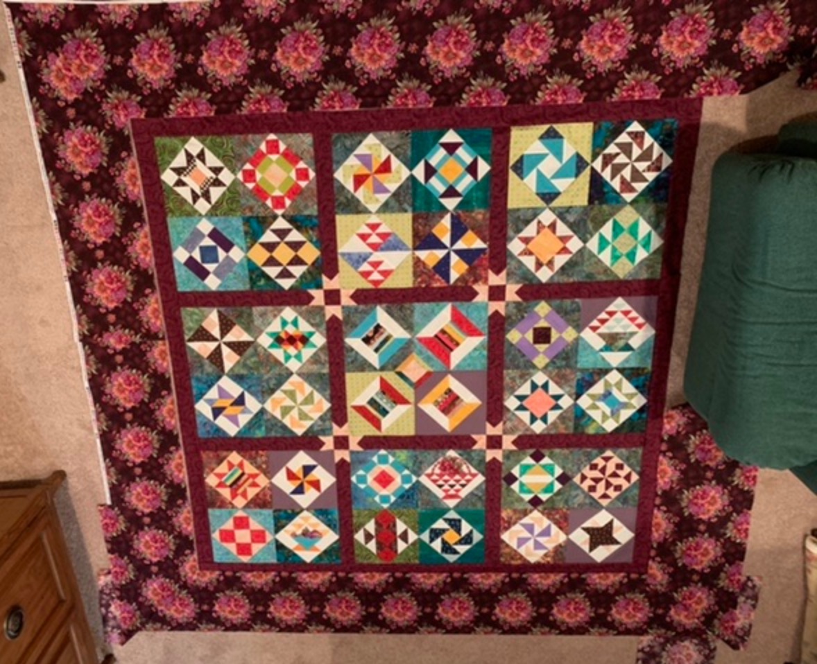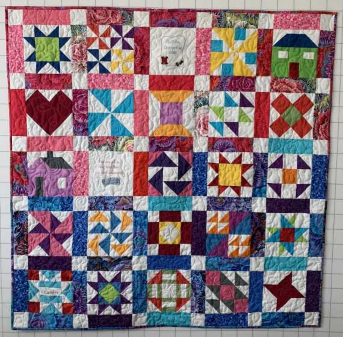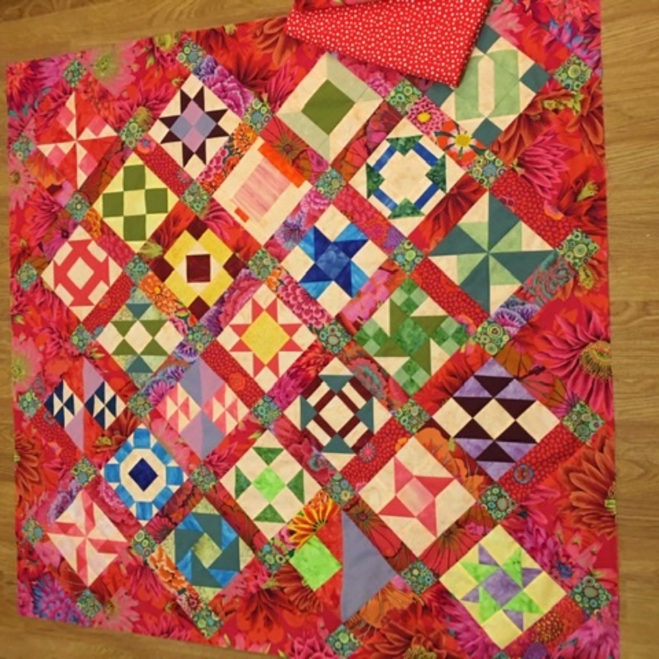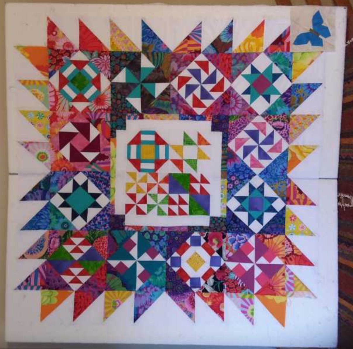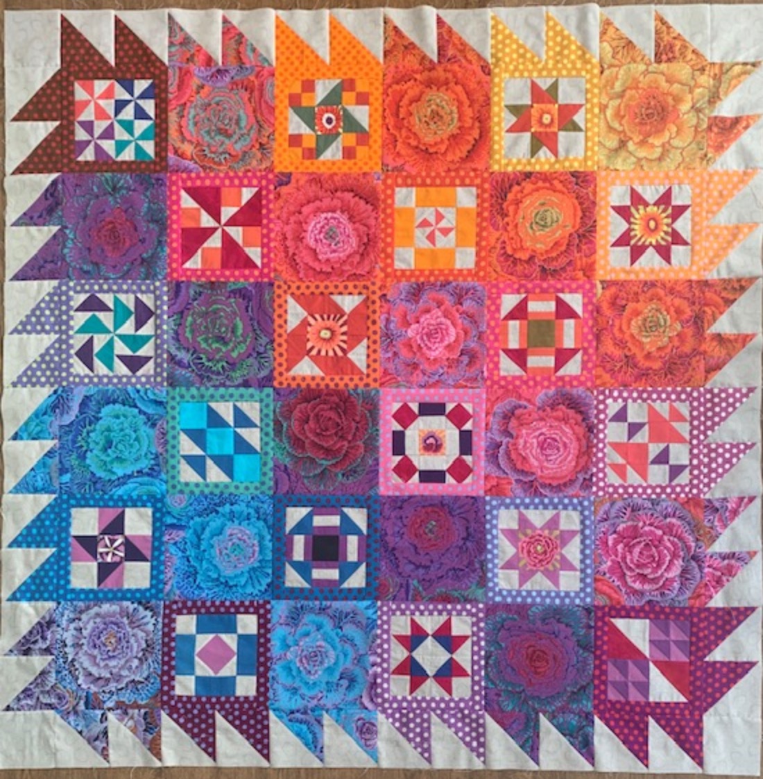 Now that the Kaffe Mystery Quilt class is over, Alex thought it would be a fun idea to see some of the TQS member's finished quilt tops. Check out all of the inventive and creative ways that members interpreted the blocks in their finished tops below, and see more in the forum.