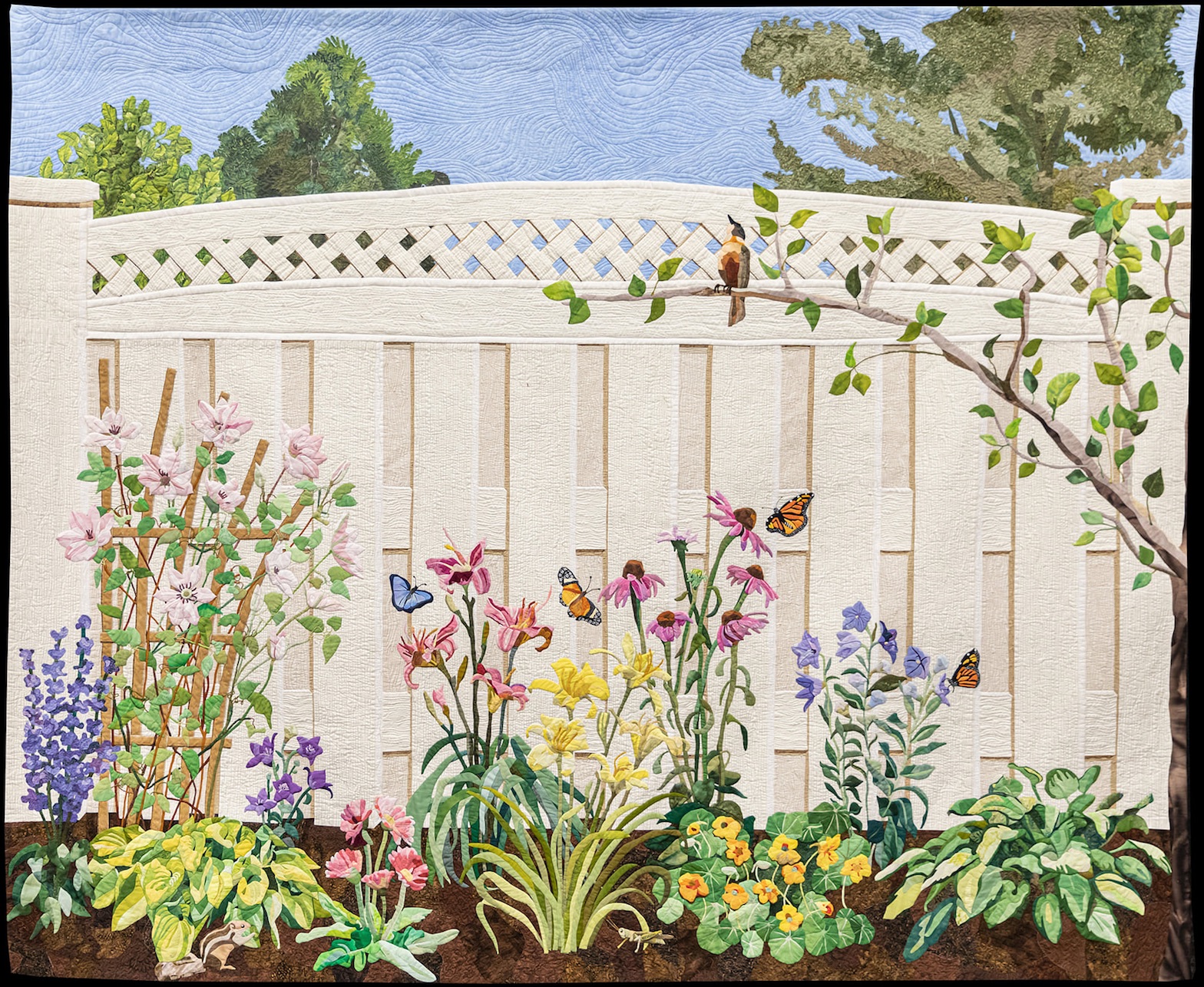 Here is Barbara’s artist statement: "Every element, including the critters, was developed from my own photos. Everything, except the fence, the trellis, the background trees and the salvia, is needle turned. The trees and salvia were created by stitching tulle over shapes. I also used tulle to shade the flowers, particularly the yellow daylilies."