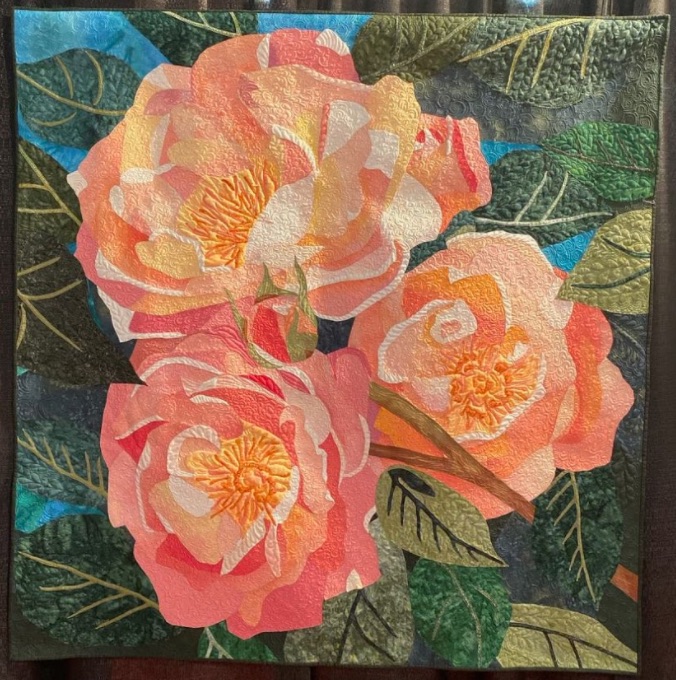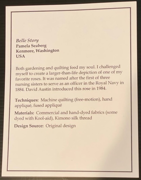 Combining her loves of quilting and gardening, Pamela Seaberg wanted to depict her favorite rose in a quilt. She did this with her quilt Belle Story, "named after the first of three nursing sisters to serve as an officer in the Royal Navy in 1884."