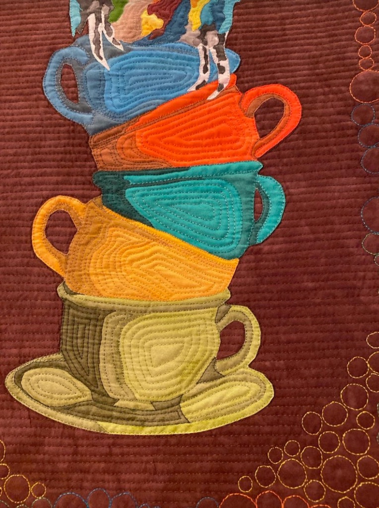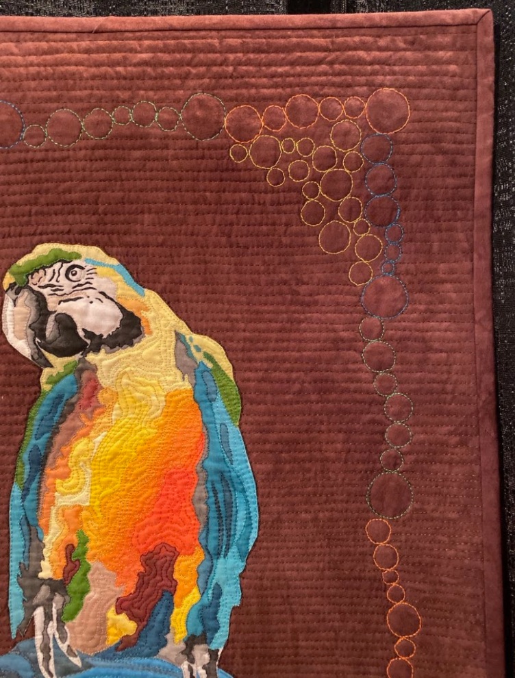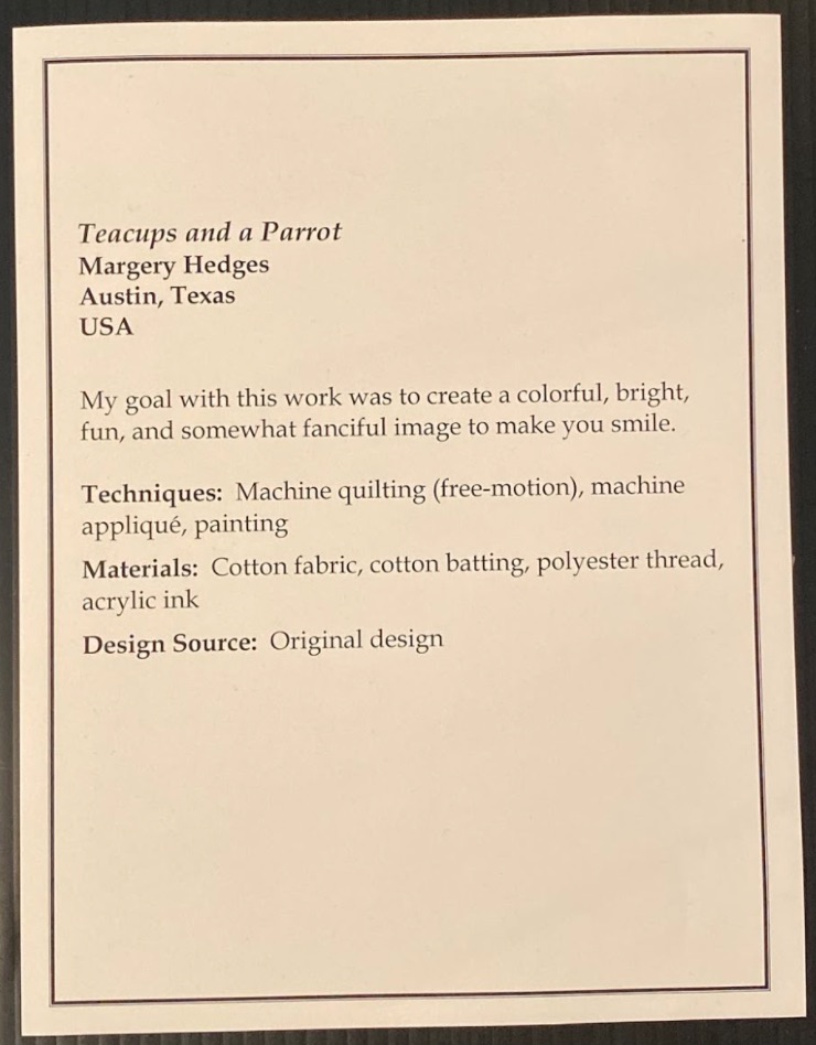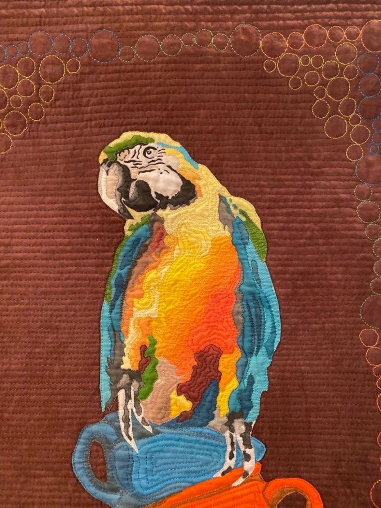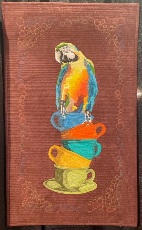 Margery Hedges' goal was to, "create a colorful, bright, fun, and somewhat fanciful image to make you smile." You get all of those things, plus some great machine quilting, in her quilt Teacups and a Parrot.