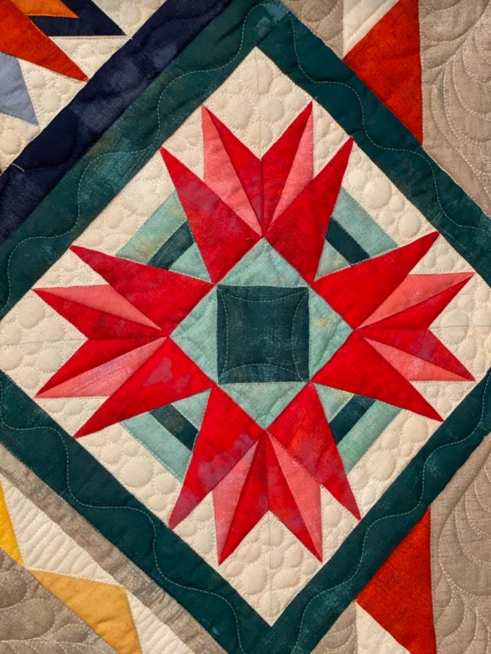 With a cavalcade of colors, Rainbow Stars by Clydene G. Sigle and quilted by Joy Johnson is a paper piecing marvel. Featuring twenty-nine star blocks it is almost like a real rainbow, you don't know where it begins or ends.