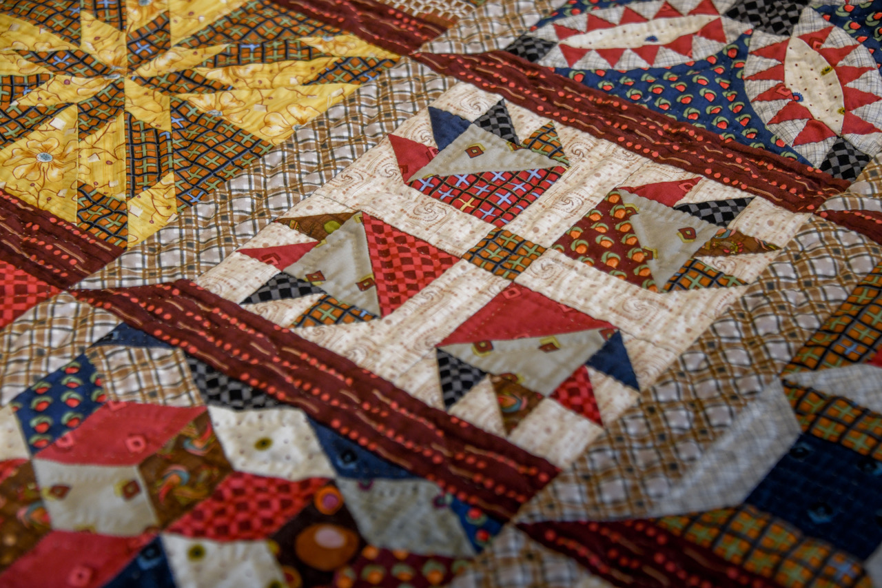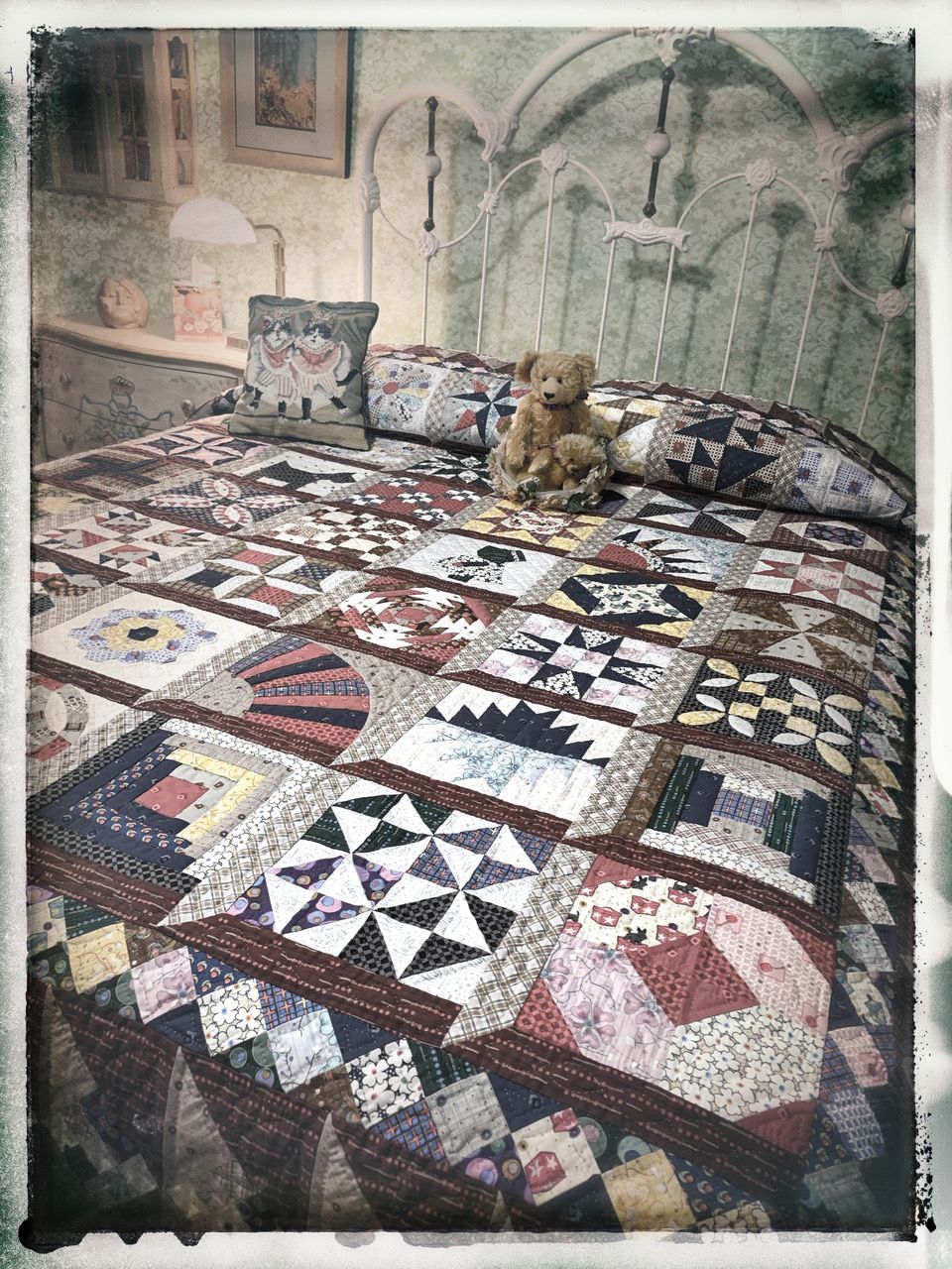 We are kicking Lizzy Albright day off by featuring the quilt that was inspired by the novel, Lizzy Albright and the Attic Window written by Ricky Tims and Kat Bowser. The Lizzy Albright Quilt AKA Granny's 1930 Sampler by Ricky, seen here in its red and tan colorway, is a recreation of Lizzy Albright's Granny's quilt and contains many meaningful references to the book. Take a look below at the many wonderful details hidden throughout this fantastically scrappy quilt!