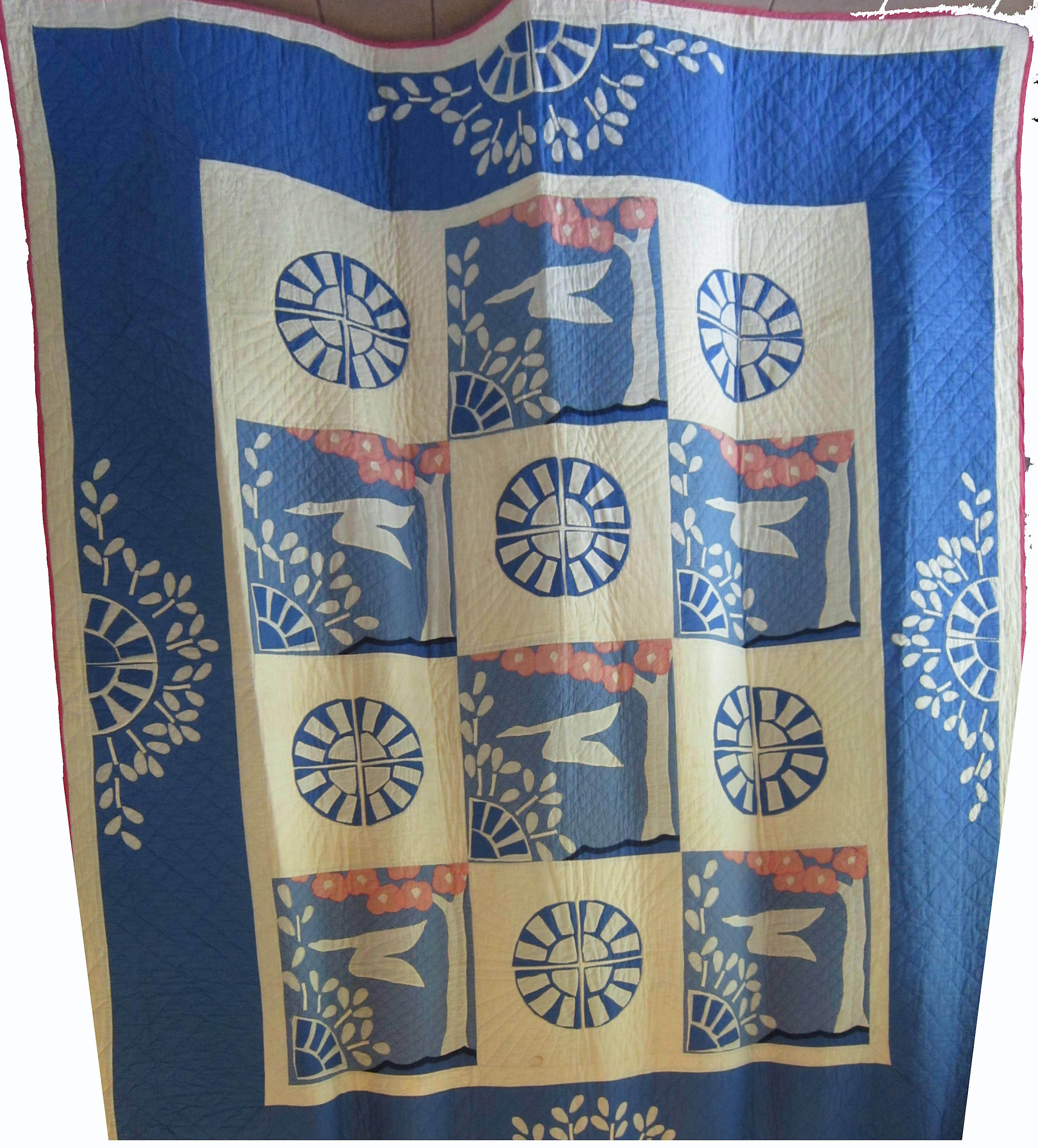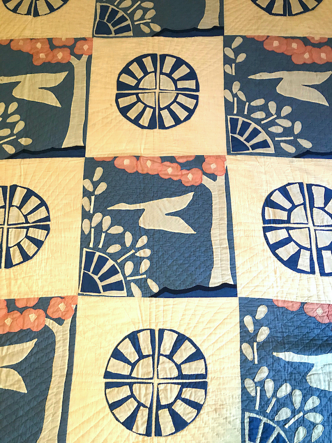 Below is the version that has come into the collection of the Museum of Texas Tech University, which we are excited about but haven’t had the opportunity to professionally photograph yet. This quiltmaker appliquéd white motifs on a blue background but otherwise made the quilt with pink tree blossoms as in the examples above.