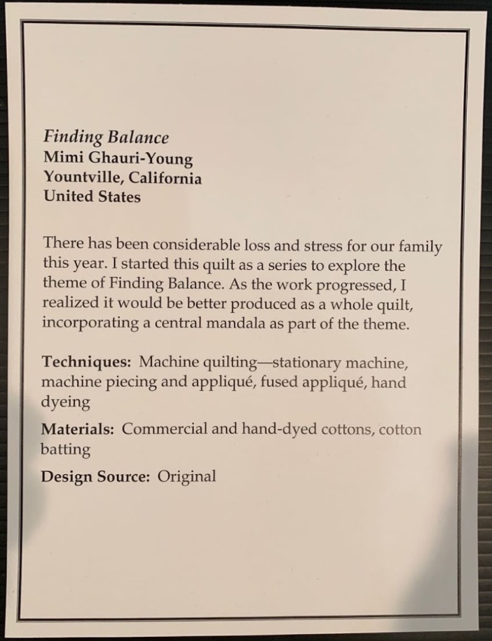 Finding Balance by Mimi Ghauri-Young of Yountville, California was featured in the Appliqué, Small category at Houston 2018.