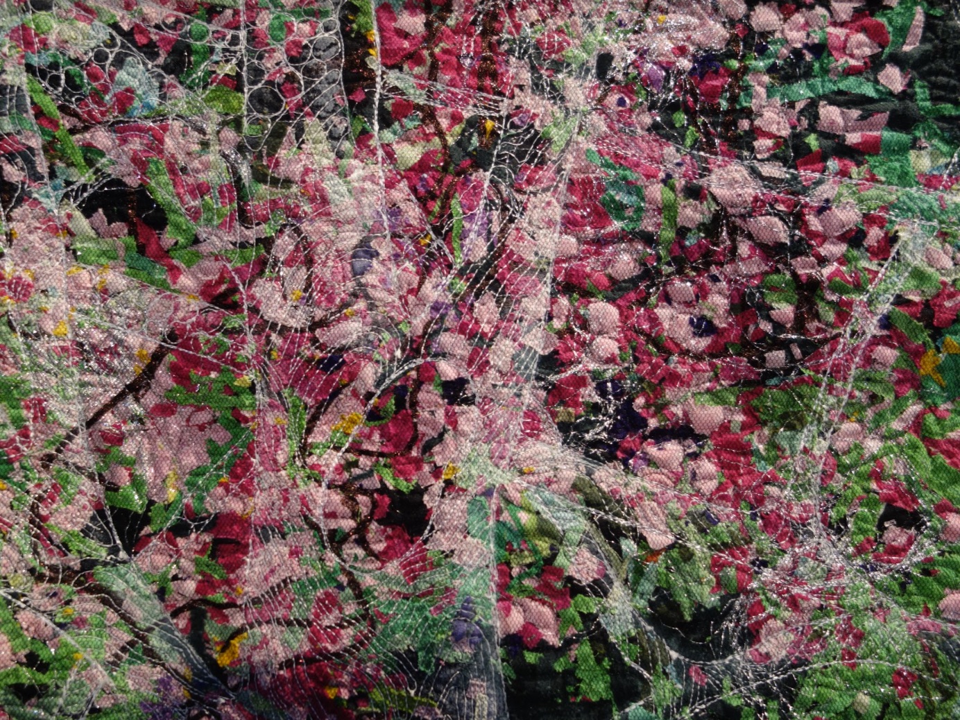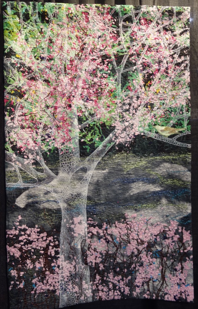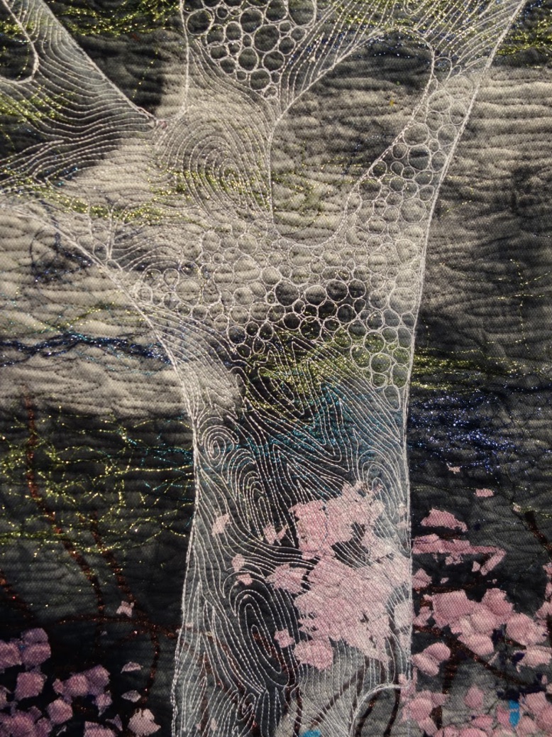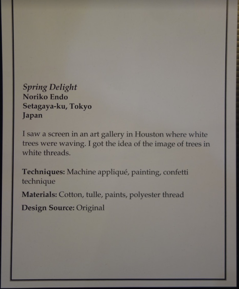 In Noriko Endo's Spring Delight, it's almost like you have a time machine to that next green Spring. Based on an image that Noriko saw of trees through a screen in Houston, she was inspired "and got the idea of the image of trees in white threads." With machine appliqué, painting, and a confetti technique, Noriko has brought abot the beauty of the season in the colder months.