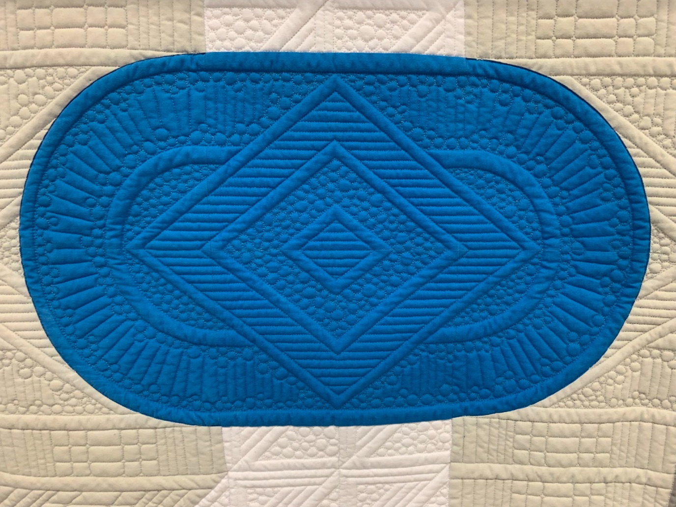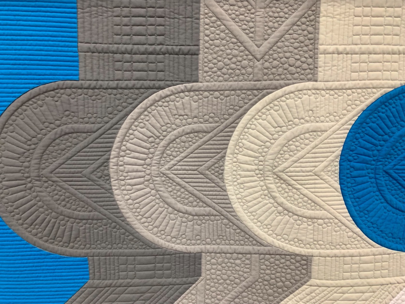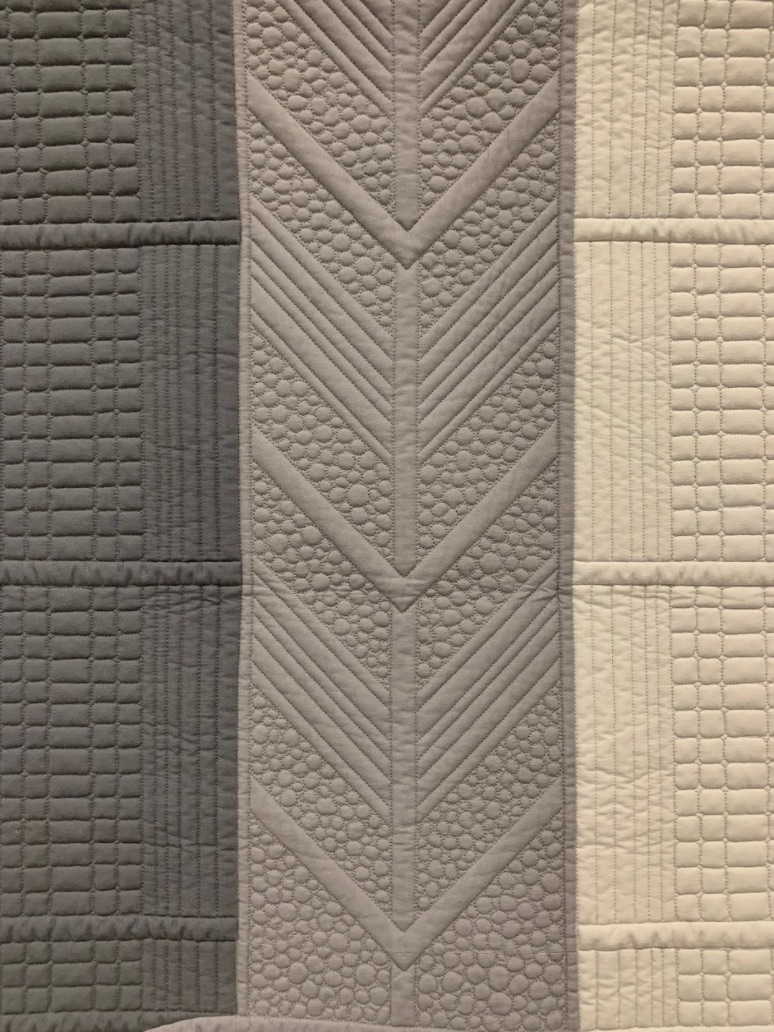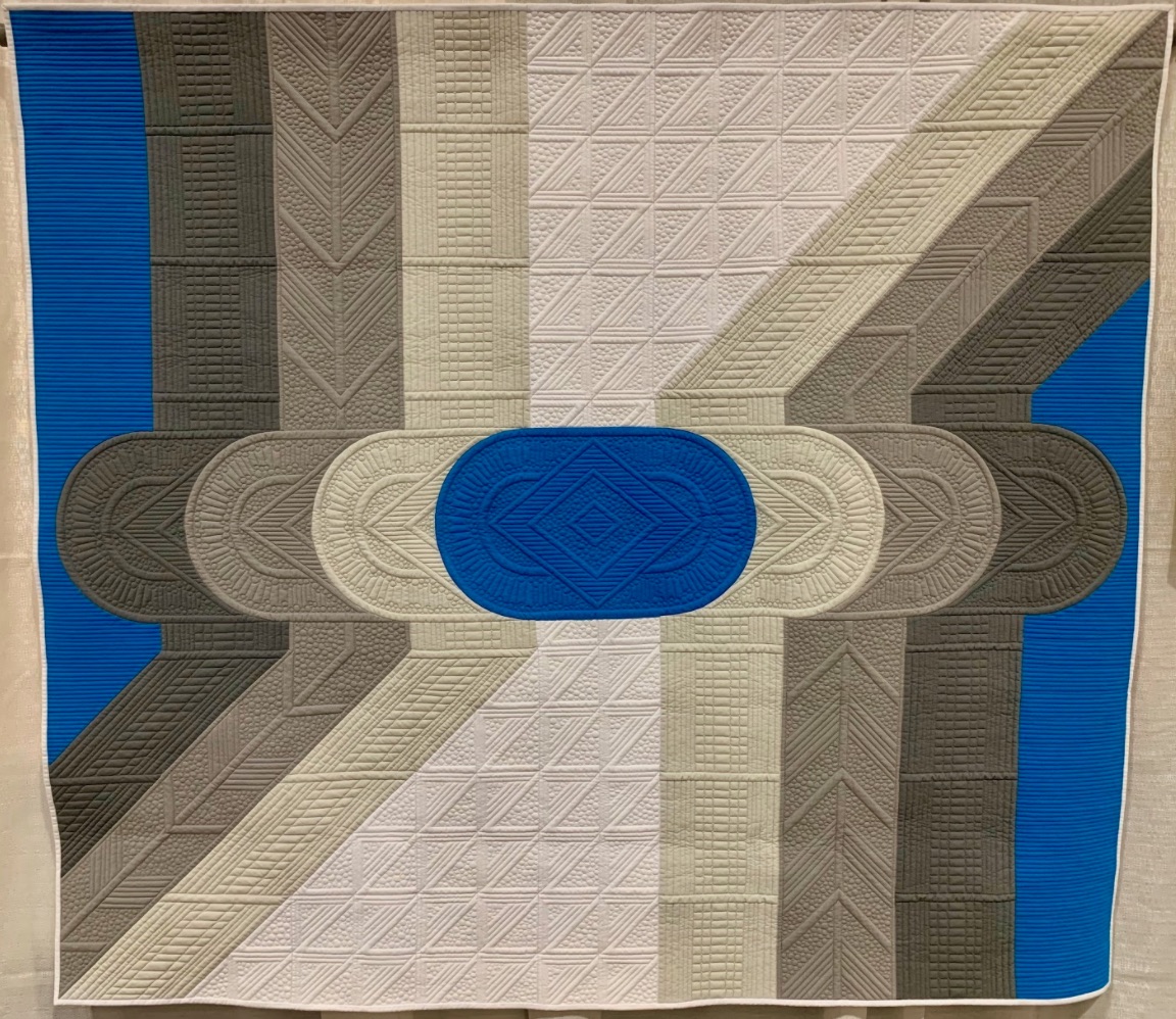 With "a very minimal, yet bold piecing design", Jodi Robinson created a modern interpretation of the Drunkards Path Block. She named it, what else, The Modern Drunk. Utilizing machine piecing and longarm machine quilting, Jodi's quilt won the Judge's Choice Modern award at PIQF in 2019. Her goal was to have the quilting "add movement to emphasize the movement created by the piecing."