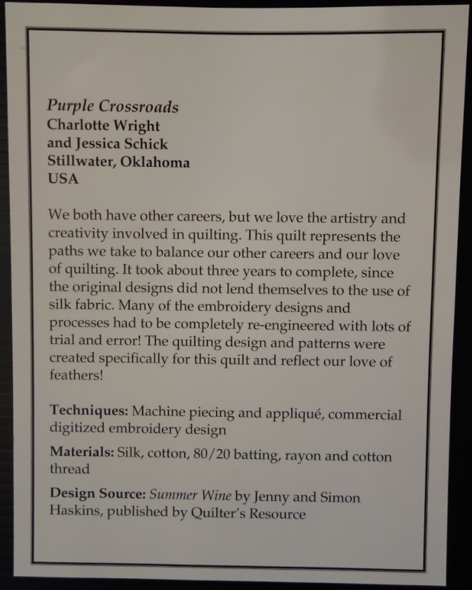 Purple Crossroads by Charlotte Wright and Jessica Schick of Stillwater, Oklahoma was featured in the Embellished category at Houston 2017.