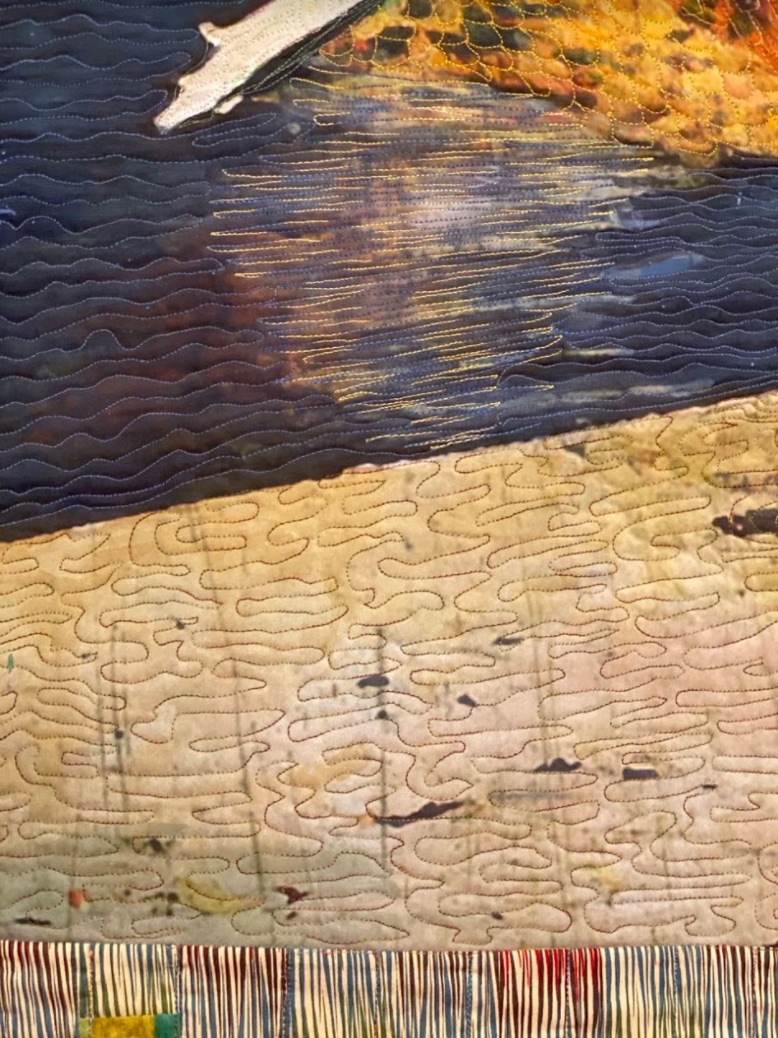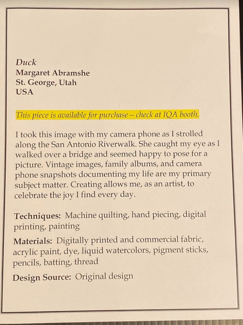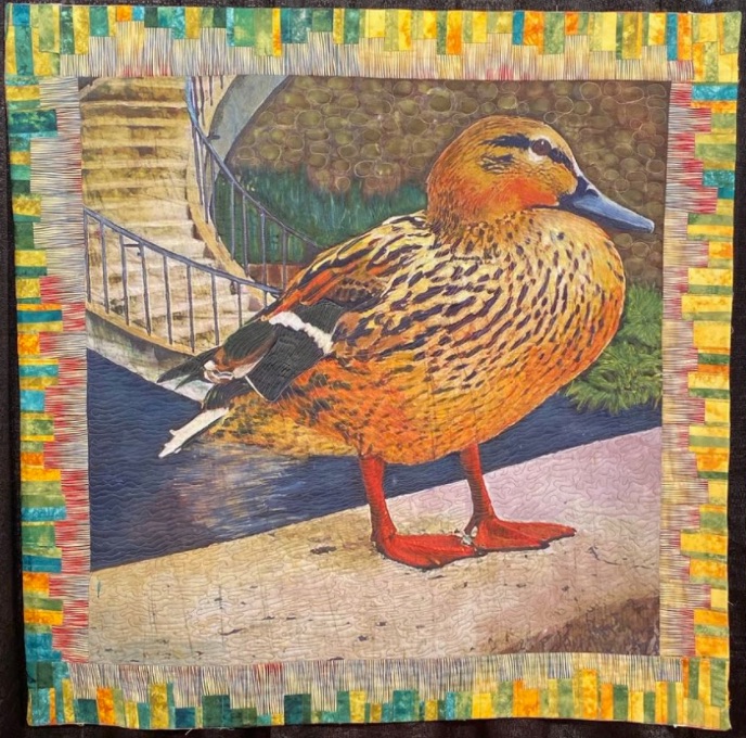 Utilizing what we see in life everyday for our quilting inspiration is something every quilter can relate to. For Margaret Abramshe that is no different. The inspiration for her Duck was just a photo she took as she "strolled along the San Antonio Riverwalk." Created with machine quilting, hand piecing, painting, and digital printing, this Duck is certainly a quilt to give a quack about.